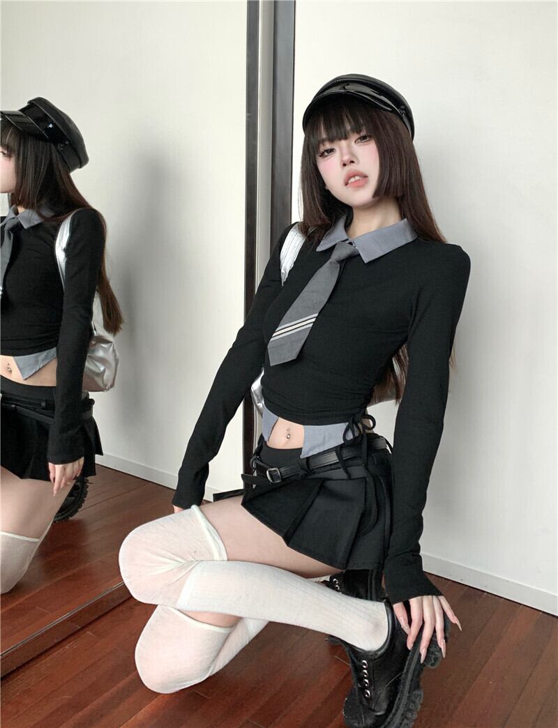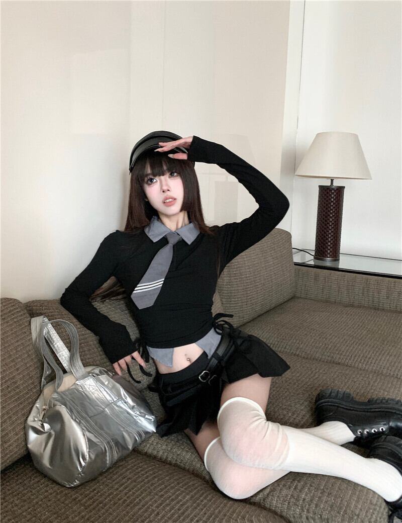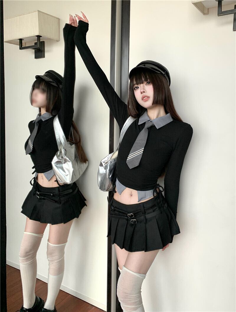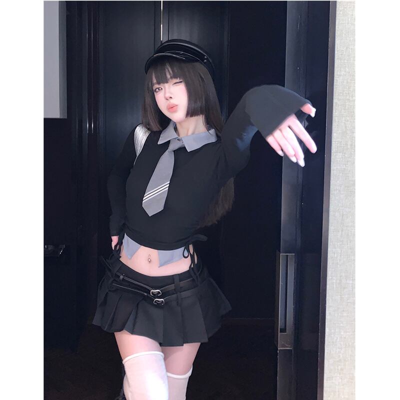 ホットガールズプレッピースタイルスーツ秋黒グレー長袖 Tシャツトップダブルベルトプリーツスカート 2 点セット ロング ブラック オータム 秋物 ハーネス