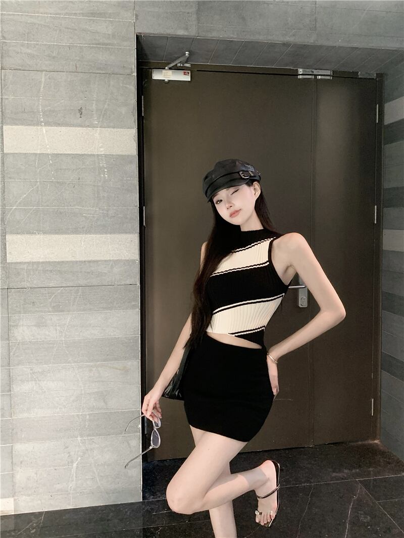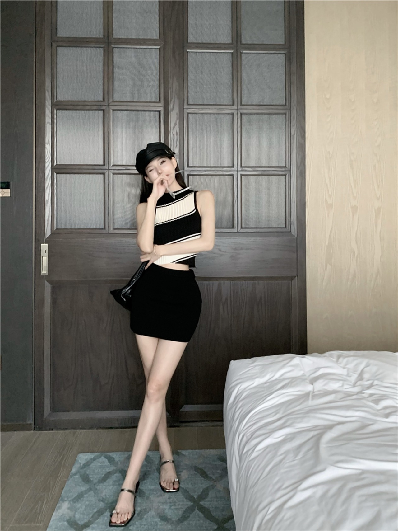 ホットガールスーツ夏黒ストライプニットタンクトップウエストセクシーラップヒップショートスカートツーピースセット服 ブラック サマー 夏物