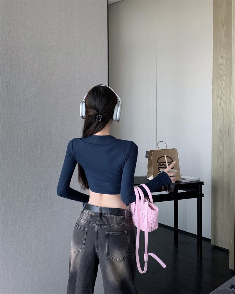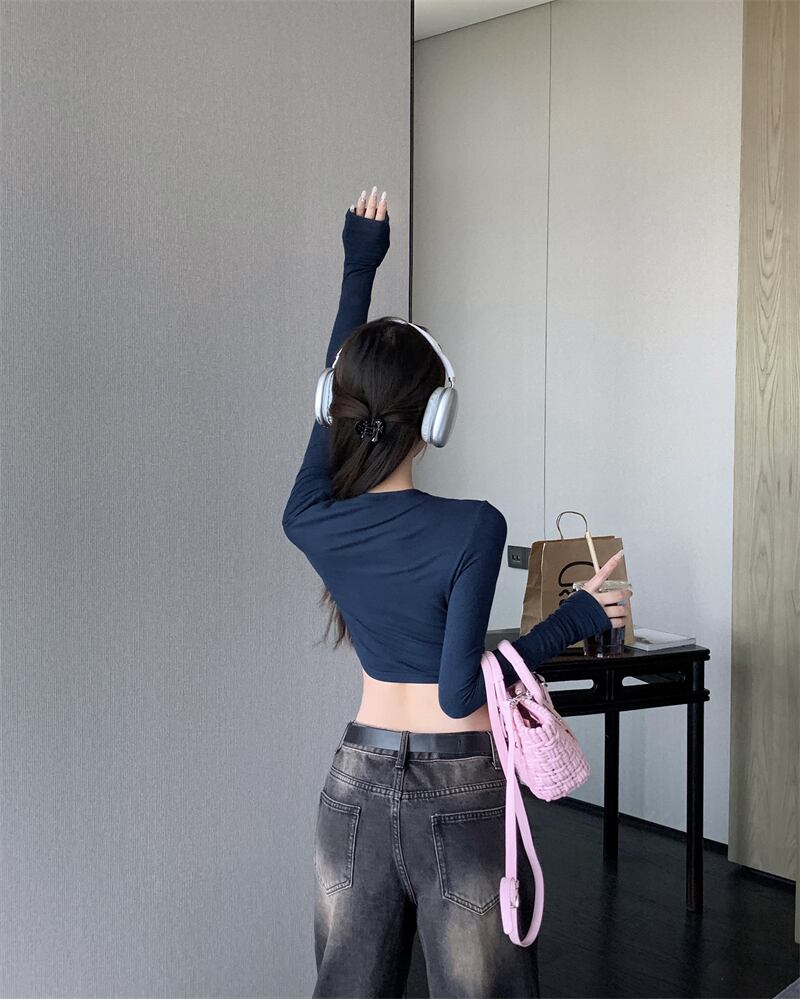 セクシー V ネック中空長袖 Tシャツ秋スパイシーガール BM タイトショートオープンへそ Tシャツ下敷きトップ ロング オータム 秋物 Vネック