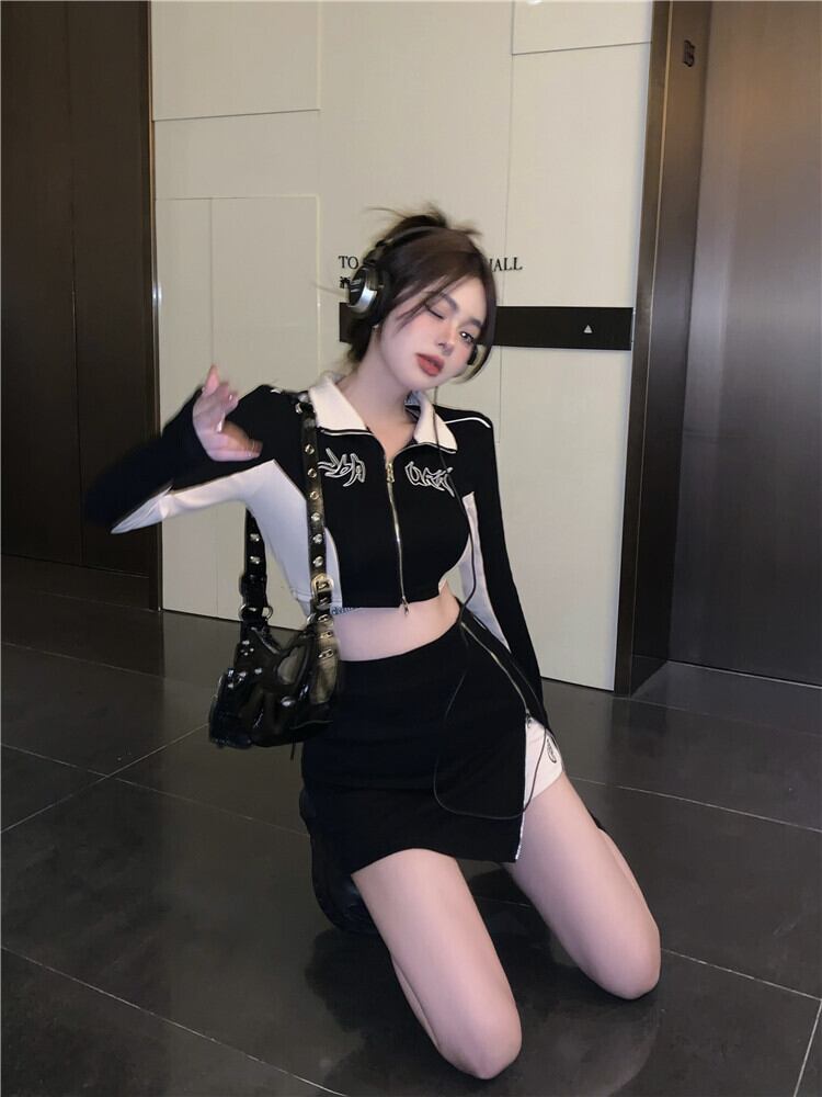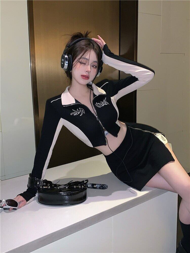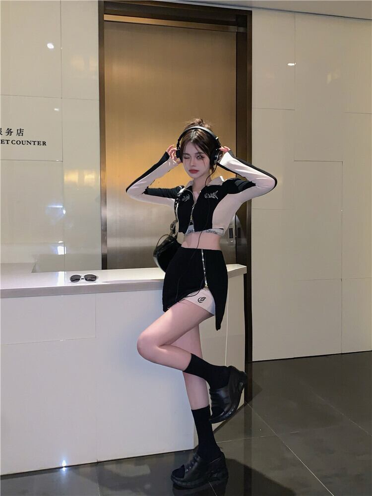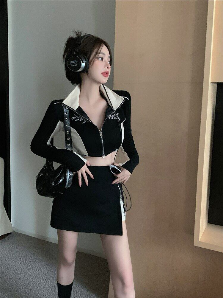 甘いホットガールスーツ夏立ち襟ニットコントラスト長袖ジャケットウエストショートスカート 2 点セット ロング 大人ガーリー スウィート キュート カジュアル サマー 夏物