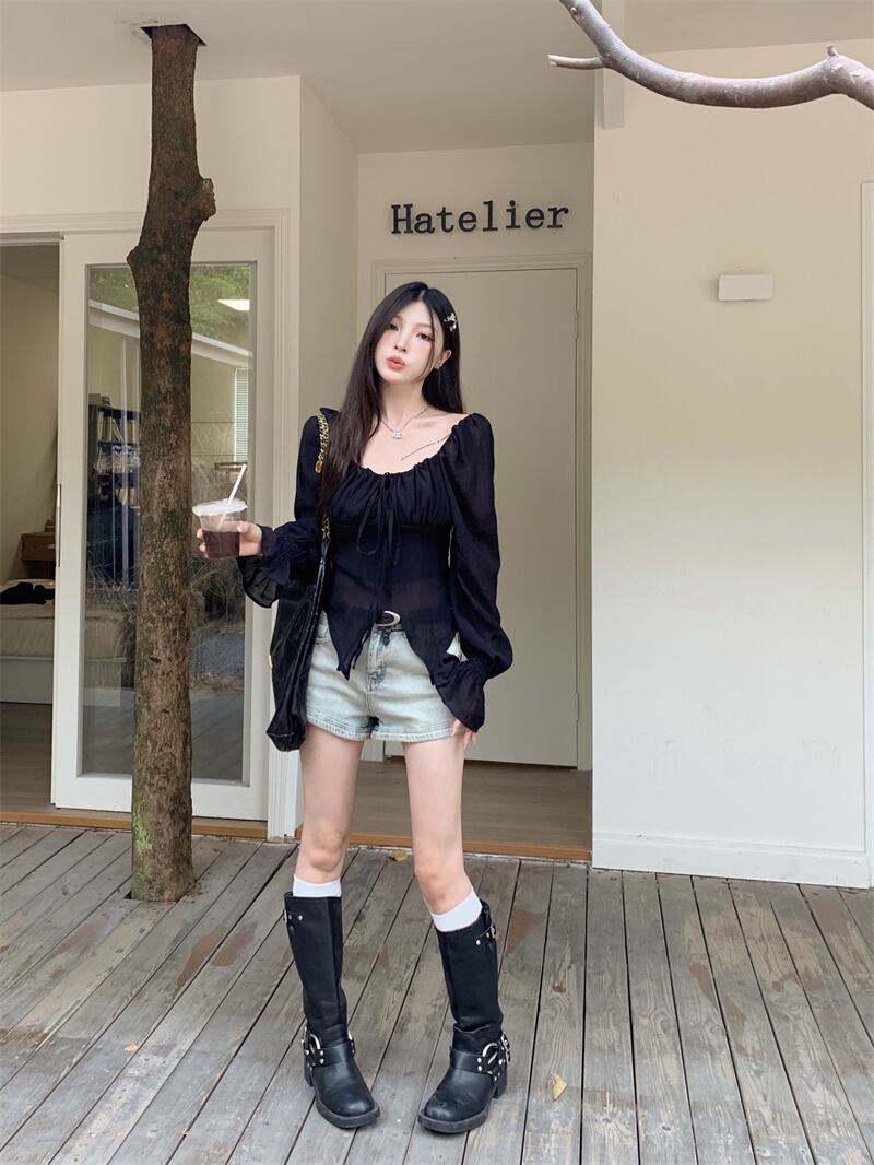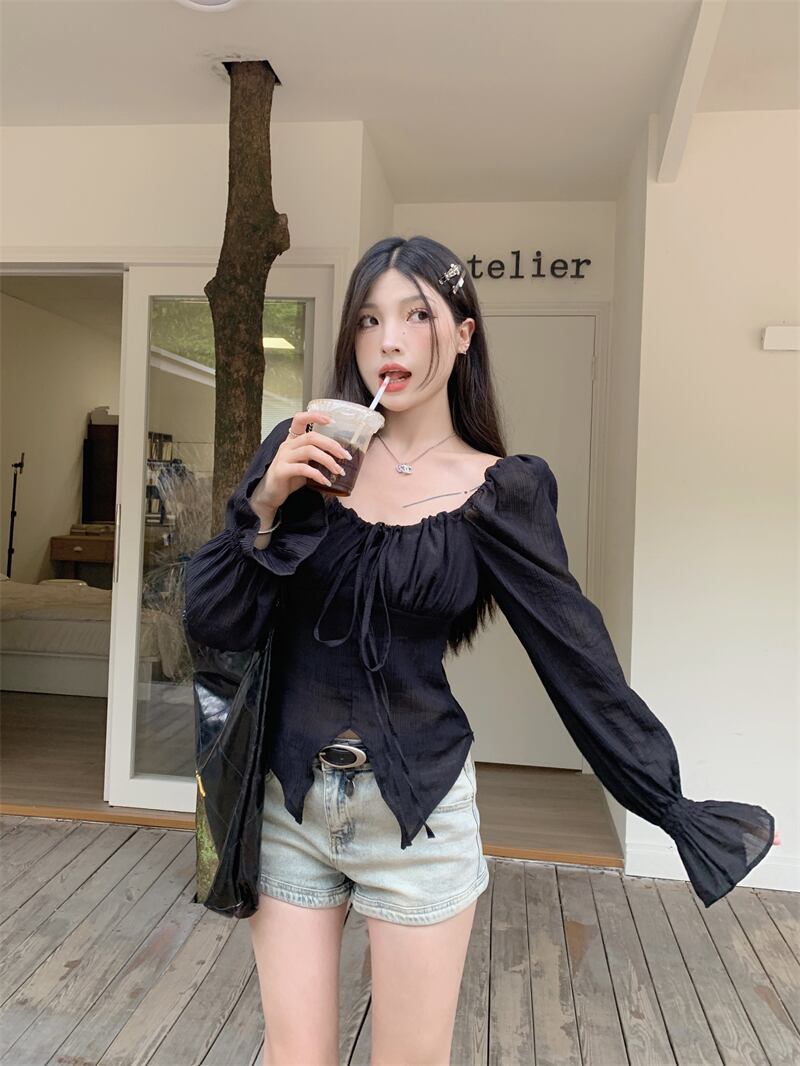 ブラックバブル長袖シャツ夏スリムフィットショートシフォンシャツスパイシーガールオフショルダーオープンバックレースアップトップ ロング サマー 夏物