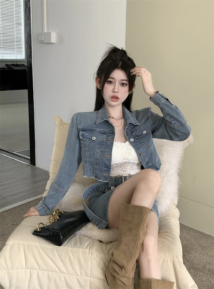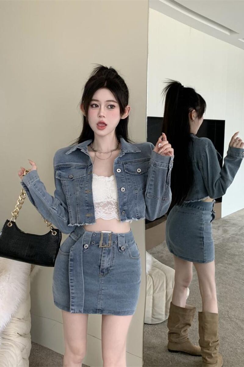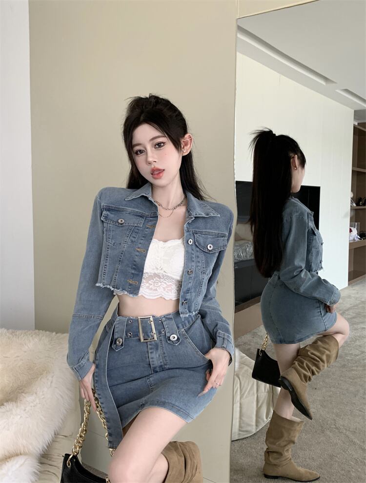 甘くてホット女子スーツ秋ショートデニムコートウエストラップヒップミニスカートツーピースセット服 大人ガーリー スウィート キュート カジュアル オータム 秋物