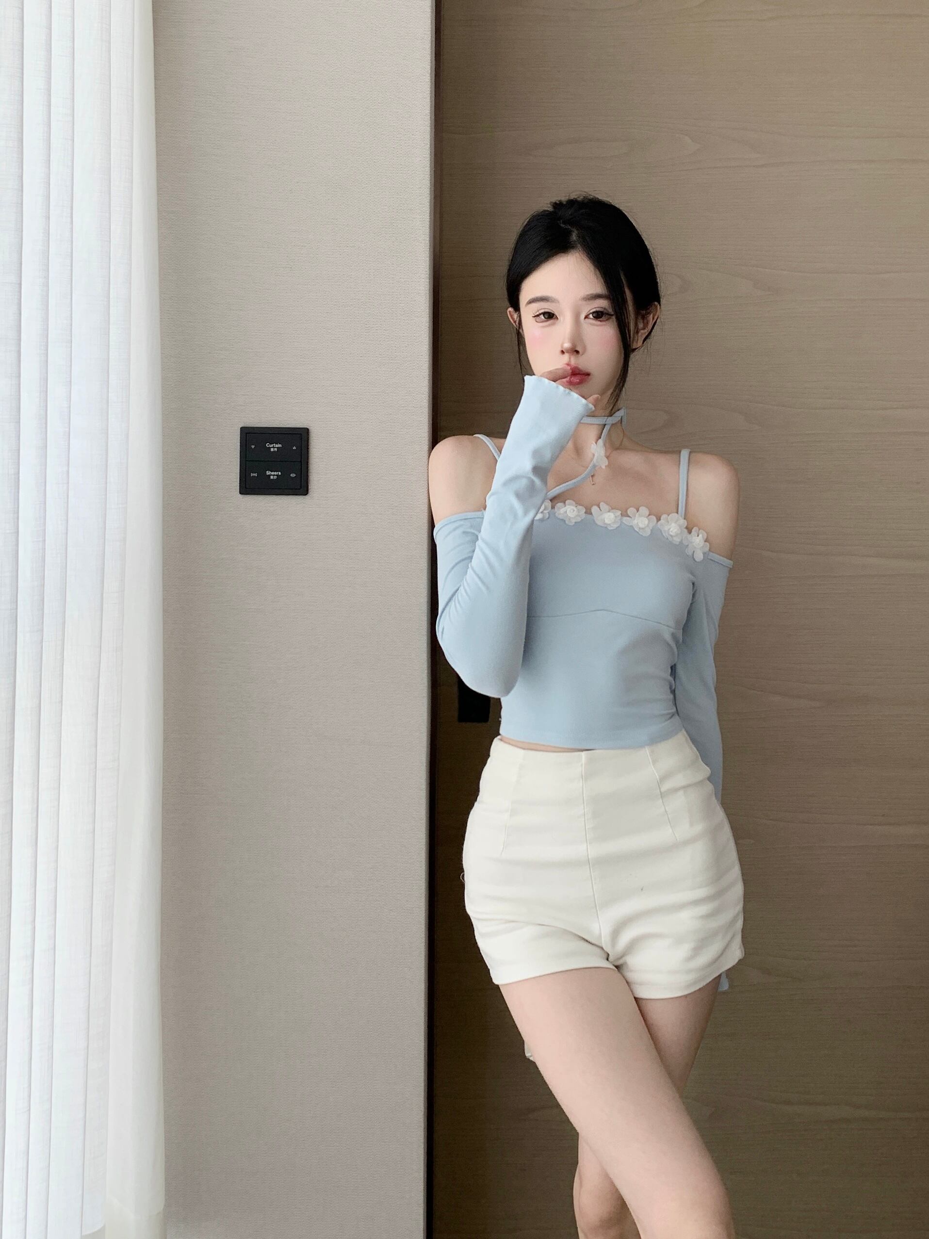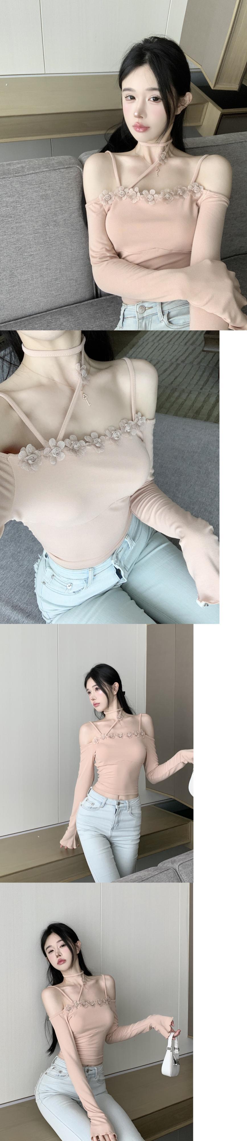 純粋セクシーで甘い女子多用途 Tシャツ秋オフショルダーフラワーストラップユニーク長袖トップ服 ロング 大人ガーリー スウィート キュート カジュアル オータム 秋物 フラワーデザイン