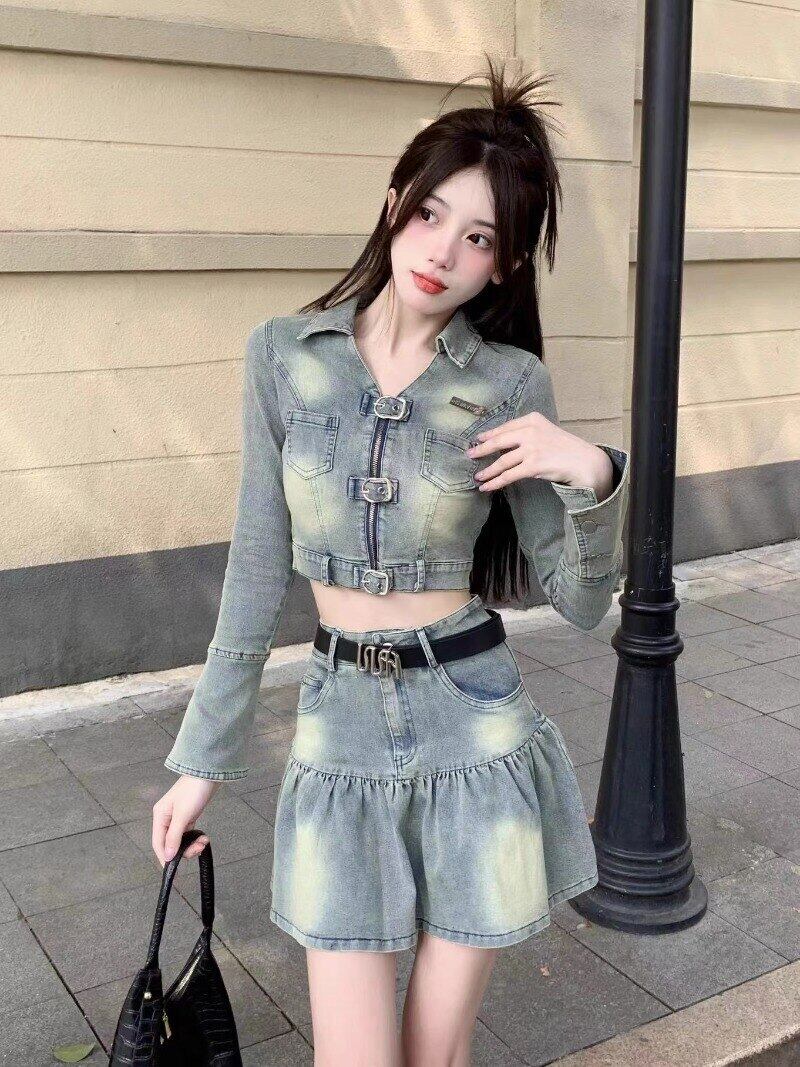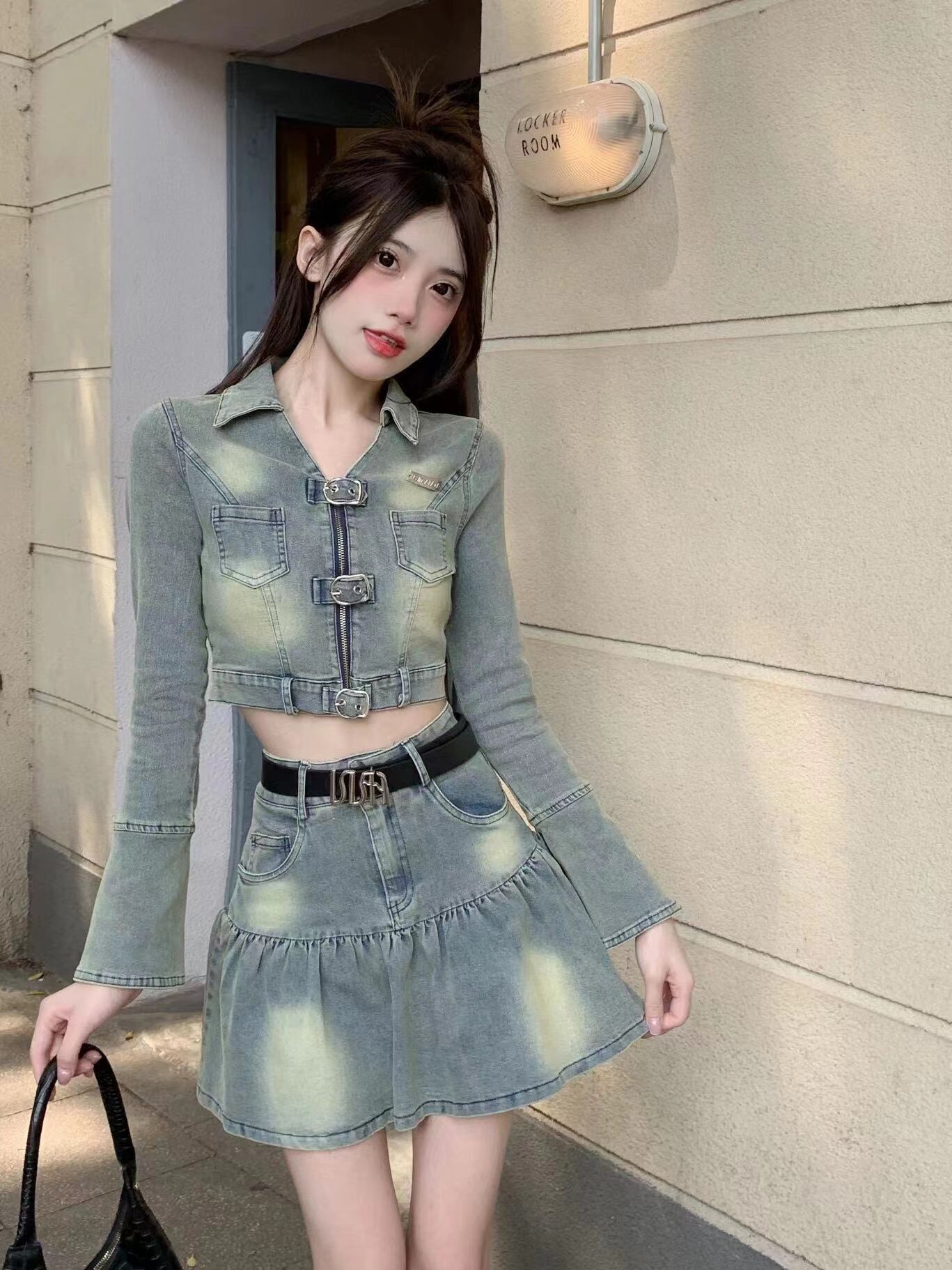 甘いホットガールスーツ秋ポロネック長袖デニムトップウエストミニスカートツーピースセット服 ロング 大人ガーリー スウィート キュート カジュアル オータム 秋物 Oネック
