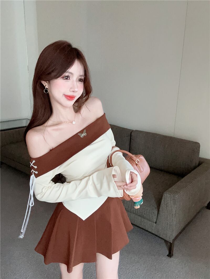 スイートホットガールズスーツレディース秋オフショルダーショートトップウエストプリーツミニスカートツーピースセット服 大人ガーリー スウィート キュート カジュアル オータム 秋物
