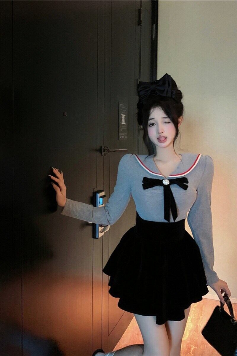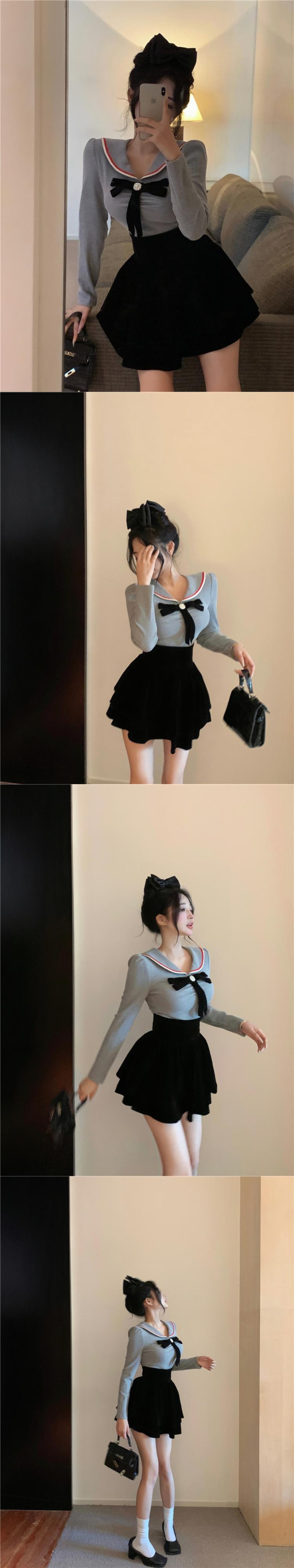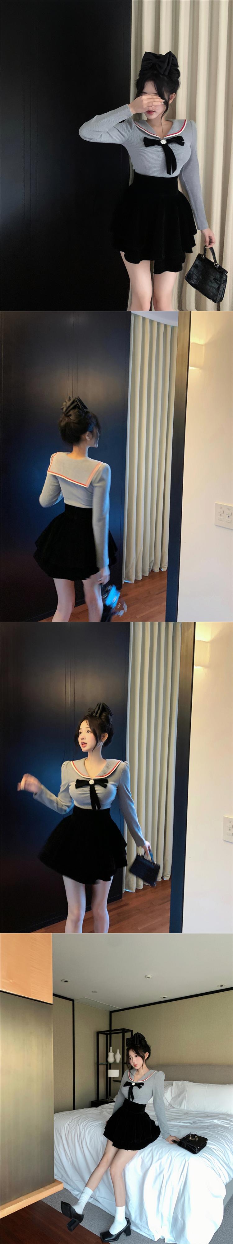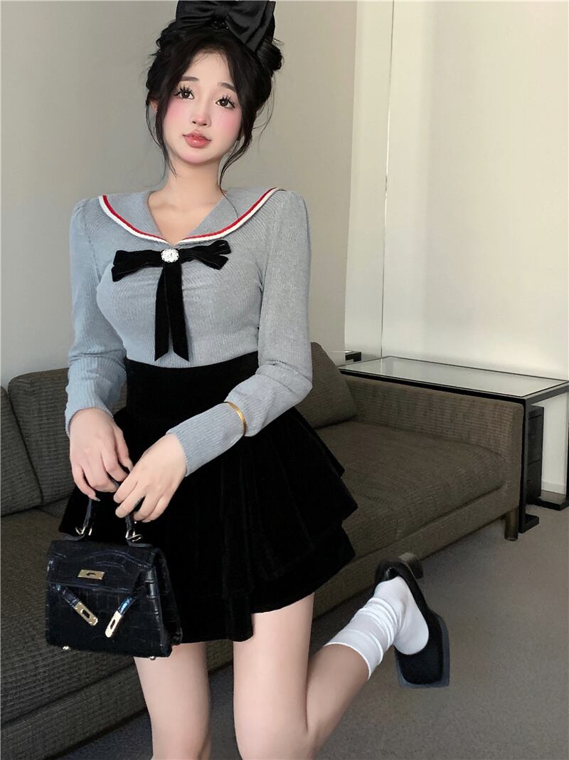 スタイルスウィートガールズスーツ秋長袖ニットシャツベルベットミニスカートツーピースセット服 ロング 大人ガーリー キュート カジュアル オータム 秋物