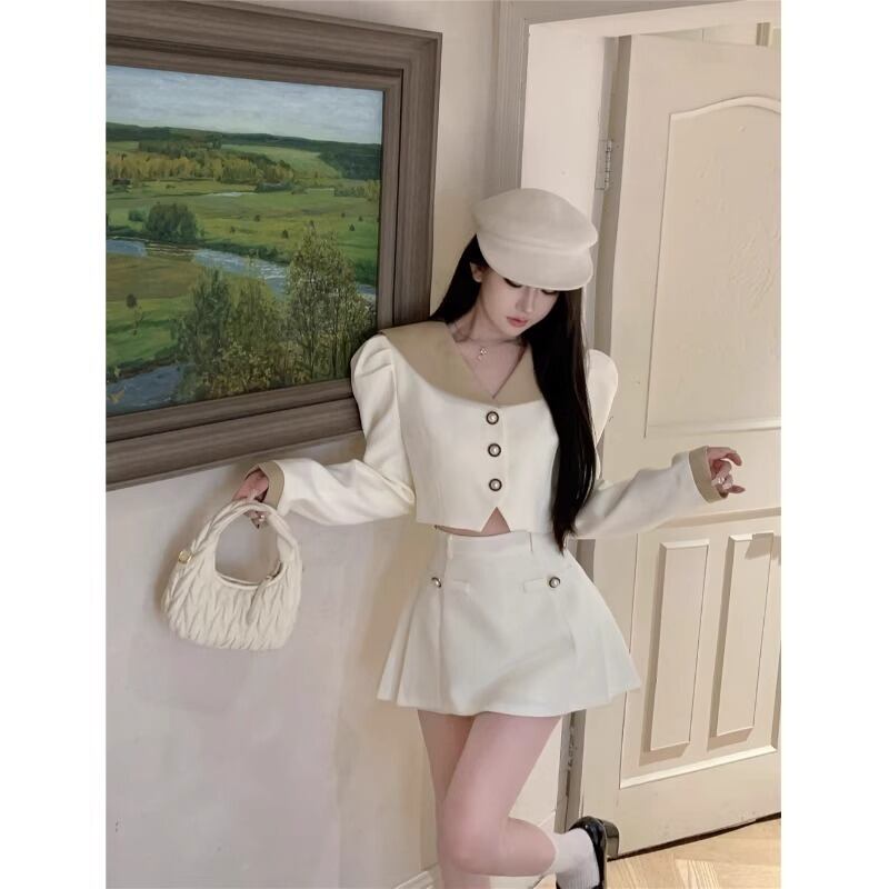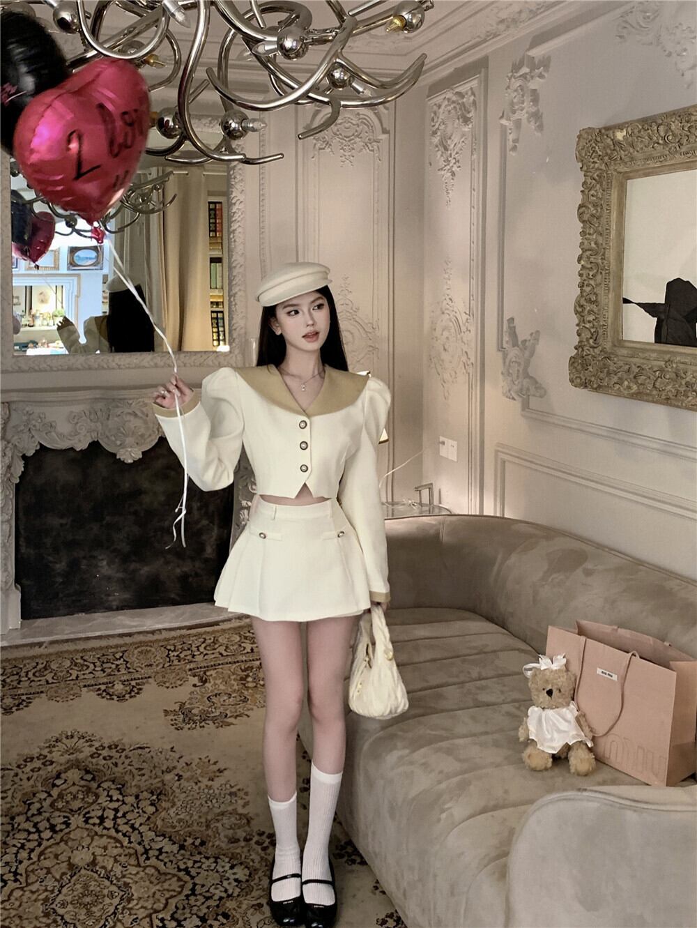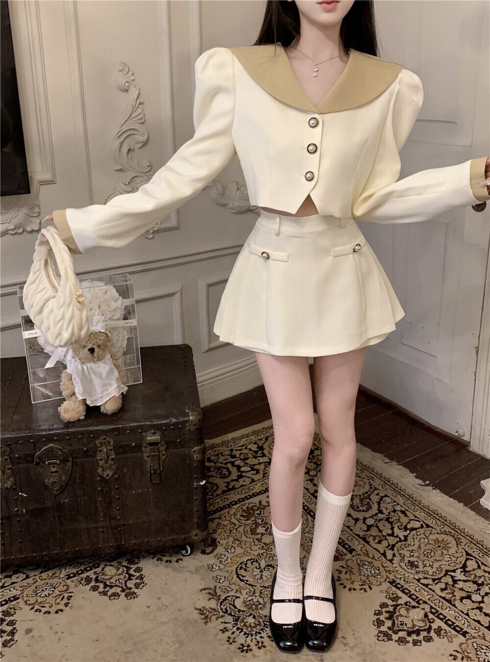 スウィートガールスーツ レディース 秋コントラスト ターンダウン襟 バブルスリーブ ショートコート ウエストプリーツ ミニスカート 2点セット 大人ガーリー キュート カジュアル オータム 秋物