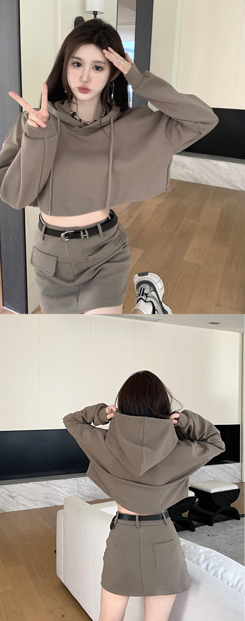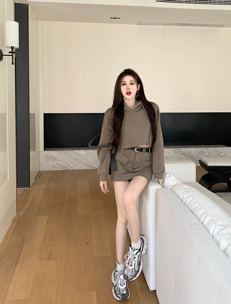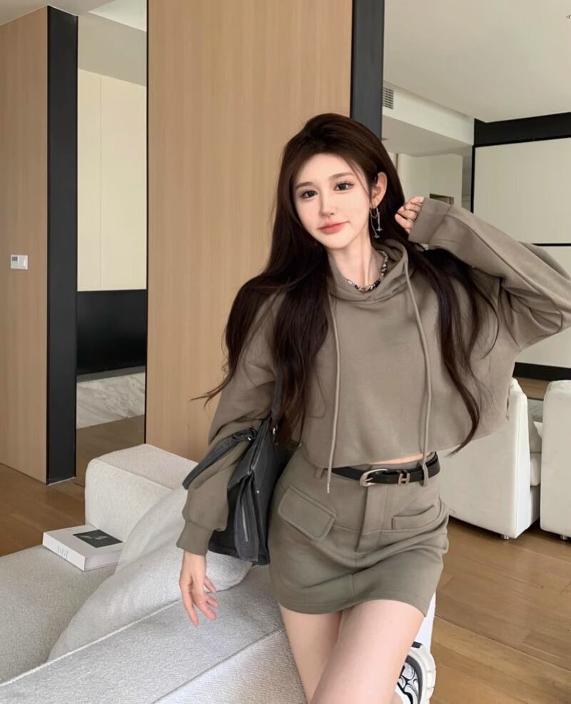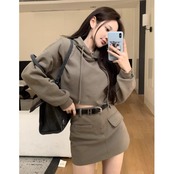 ホットガール純粋セクシースーツ秋ルーズショートフード付きプルオーバーウエストラップヒップミニスカートツーピースセット服 オータム 秋物 ピュア