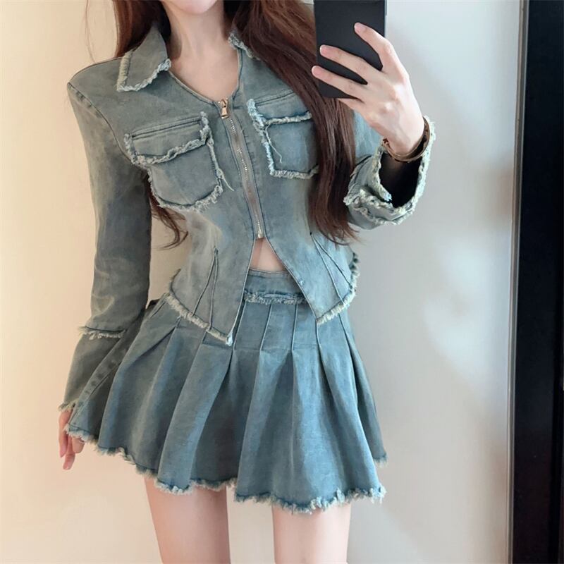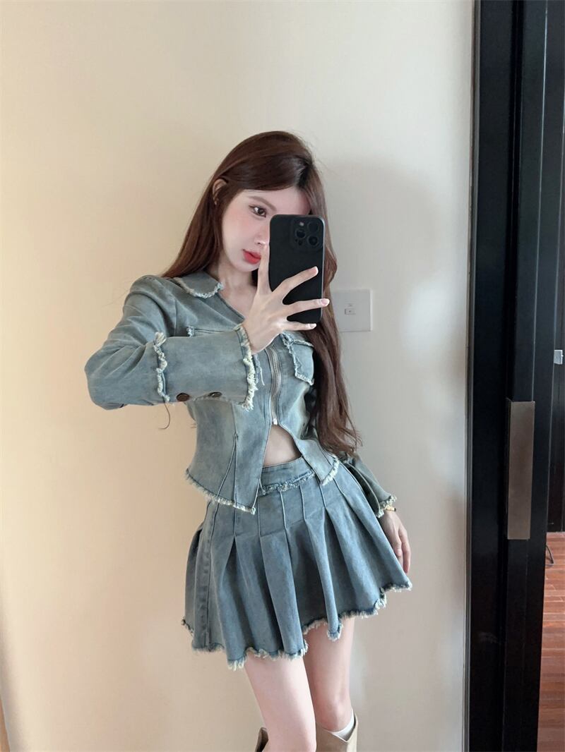 アメリカンホットガールレトロスーツ秋長袖洗浄ぬいぐるみデニムコート A ラインショートスカート 2 点セット服 ロング オータム 秋物 Aライン