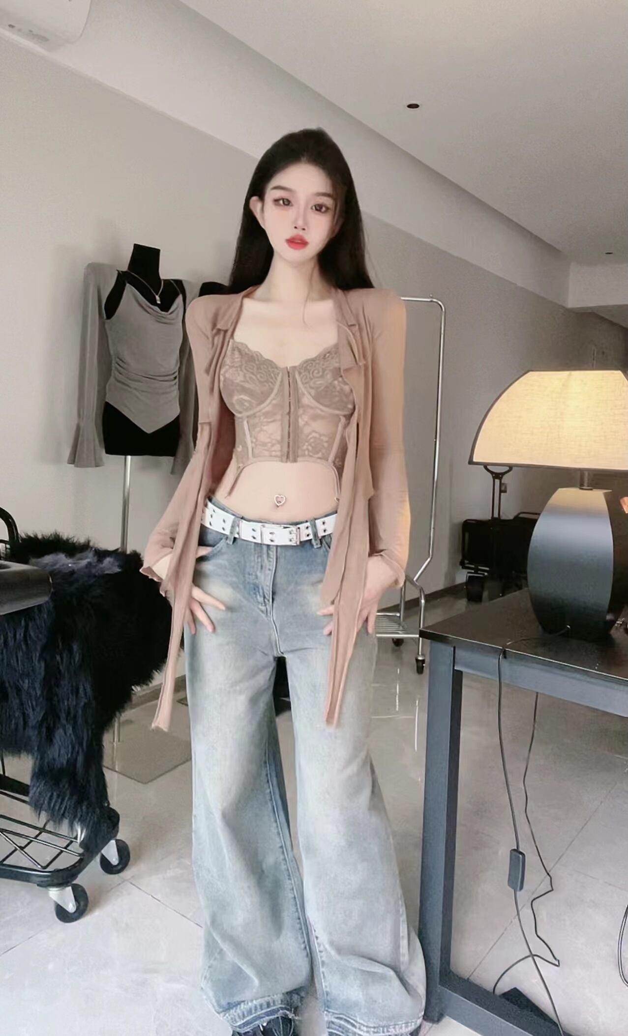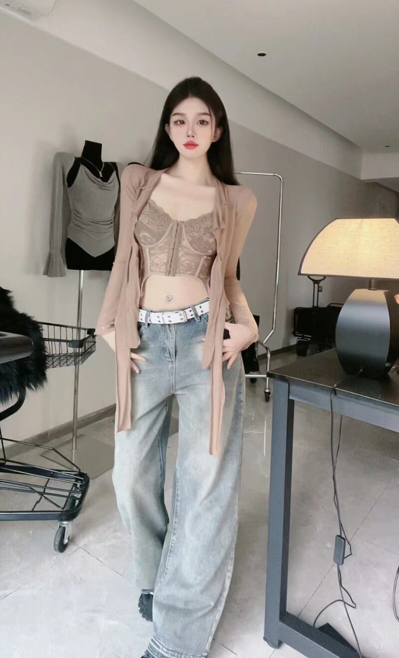 ホットガールズセクシースーツ秋レースフィッシュボーンストラップタンクショートカーディガントップワイドレッグジーンズ 3 点セット オータム 秋物 ワイドパンツ