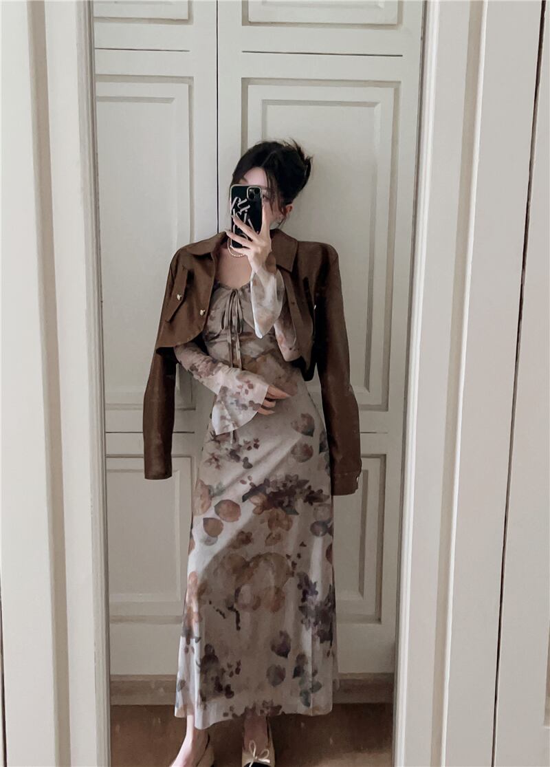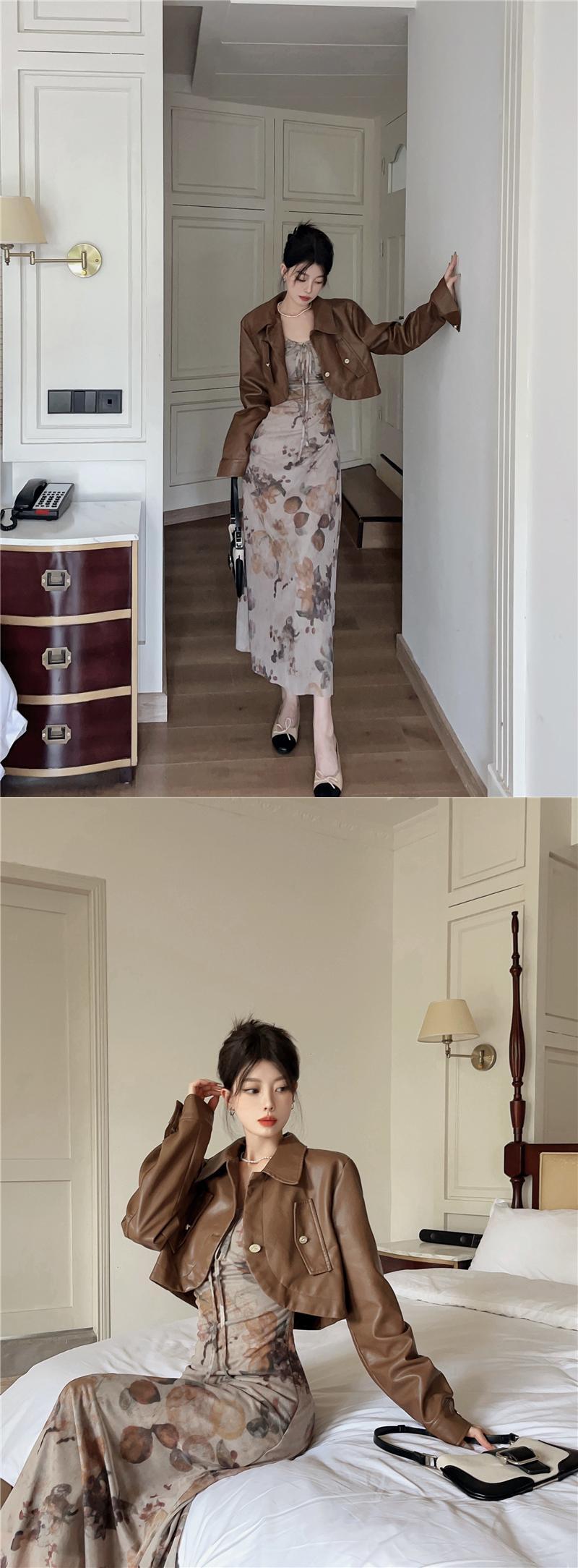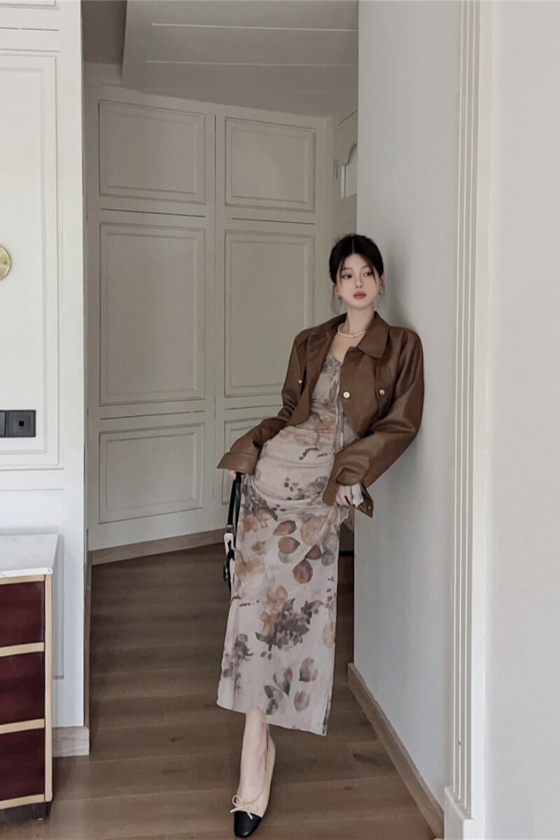 アメリカンレトロスーツ秋ショートレザーコートスリムフィット V ネックインクプリントドレス 2 点セット服 オータム 秋物 Vネック