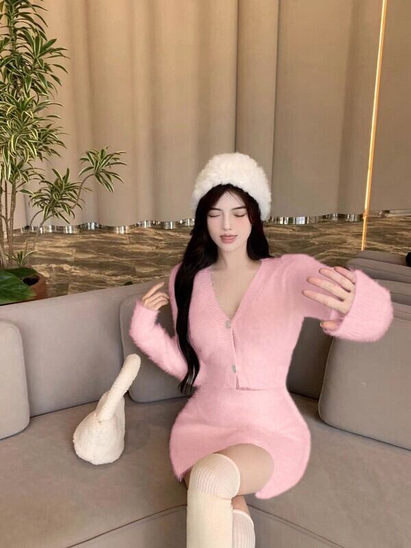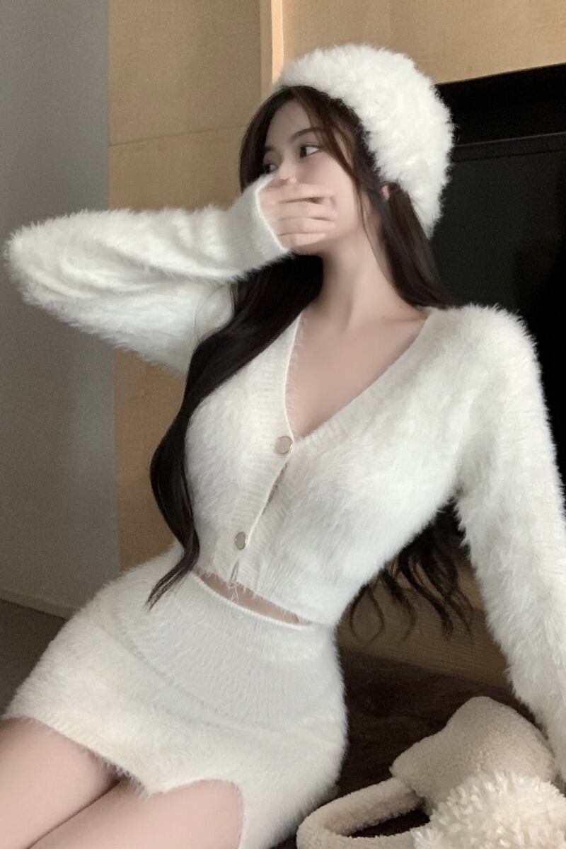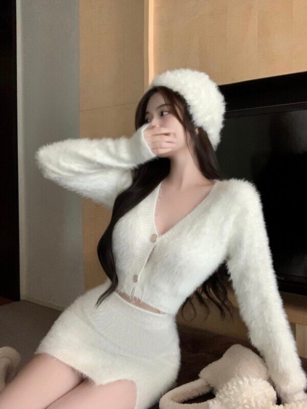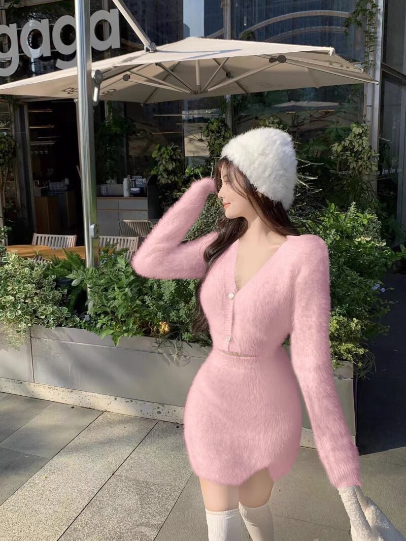 ホットガール純粋セクシースーツ秋と冬モヘアショートカーディガンラップヒップミニスカートツーピースセット服 オータム 秋物 ウィンター 冬物 ピュア