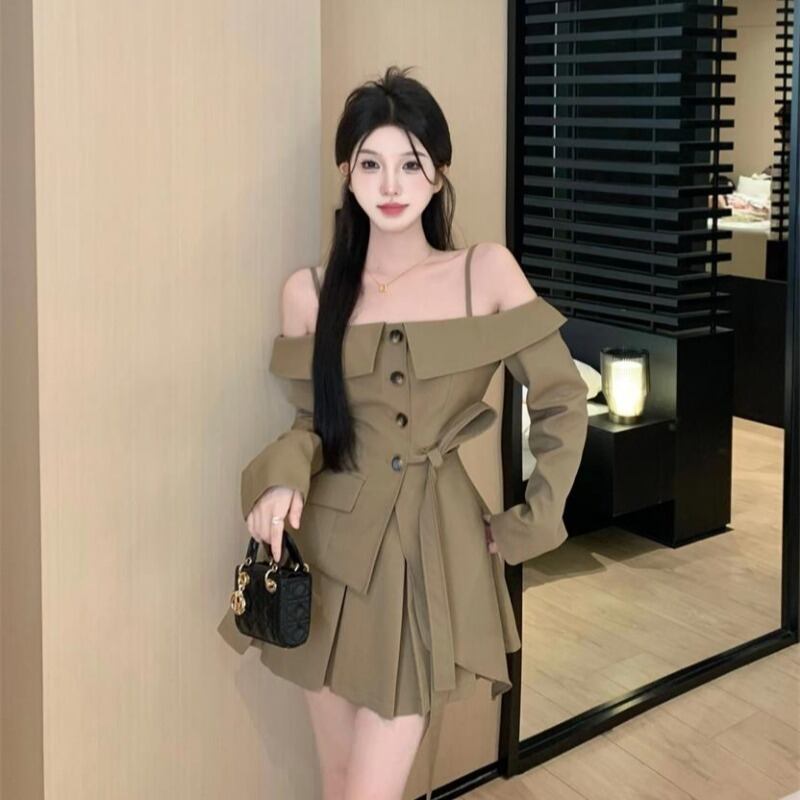 スーツ レディース 秋 スラッシュネック スリムフィット オフショルダー トップ プリーツ スカート 2点セット 服 オータム 秋物