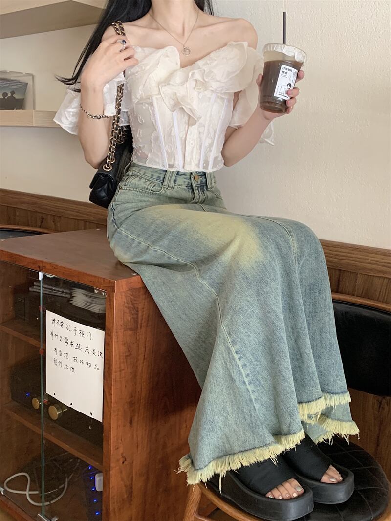 フレンチスタイル白フリルオフショルダーシャツ夏魚骨ウエストスリムスラッシュネックショートトップ服 ホワイト サマー 夏物