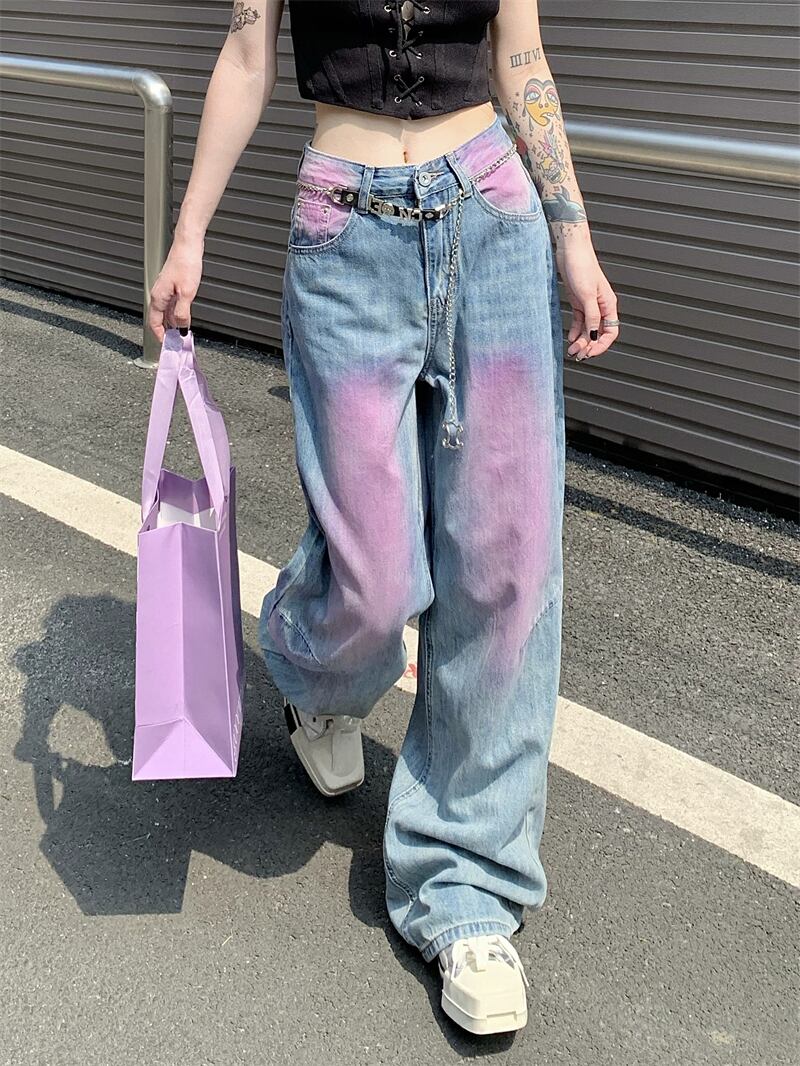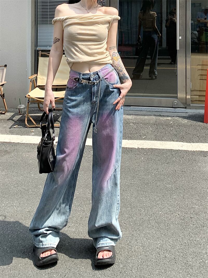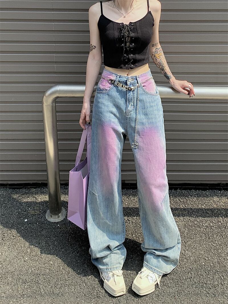 アメリカンストリートウォッシュグラデーションジーンズレディース秋ウエストルーズワイドレッグフロアドラッグパンツ服 オータム 秋物 ワイドパンツ