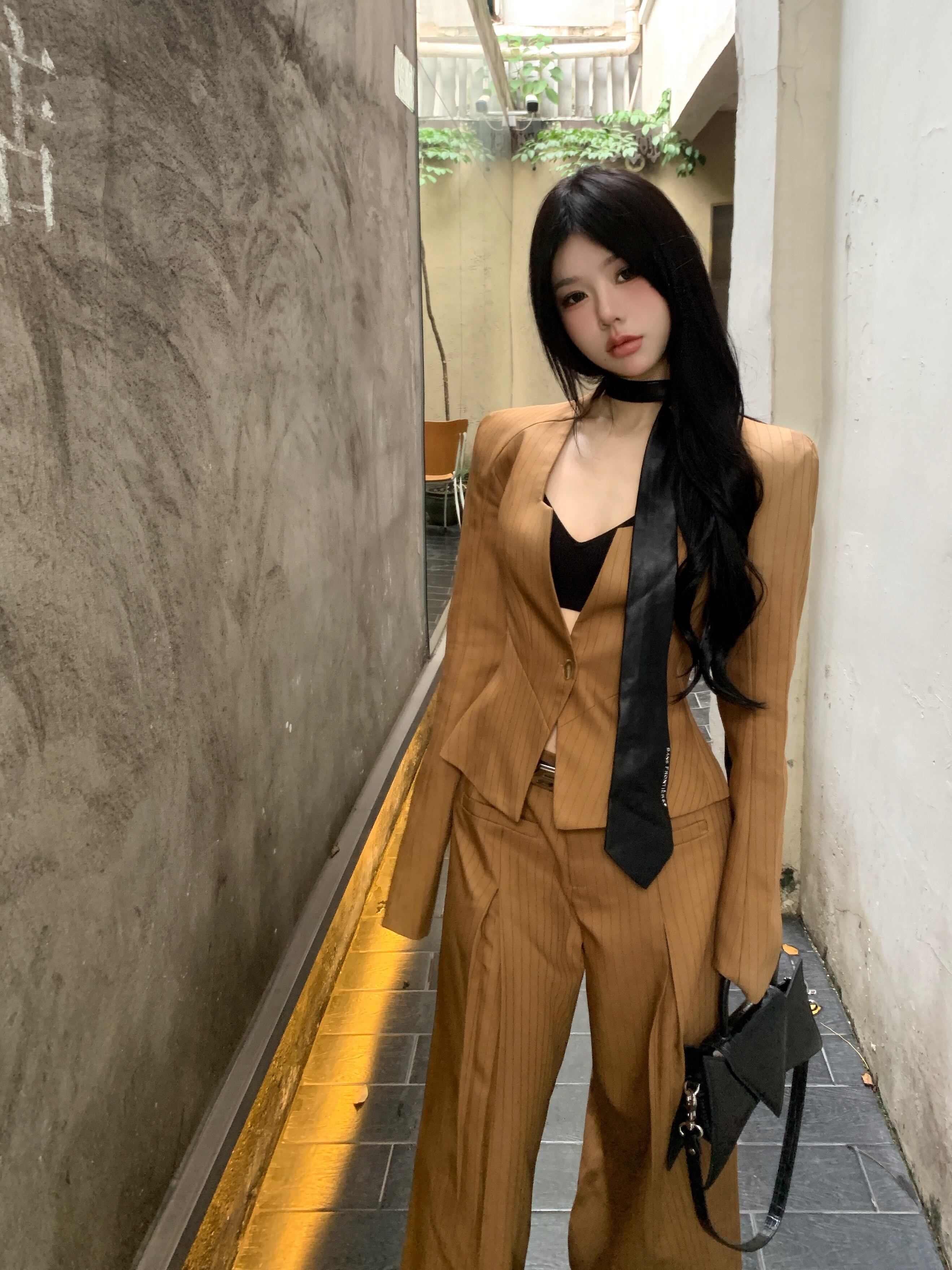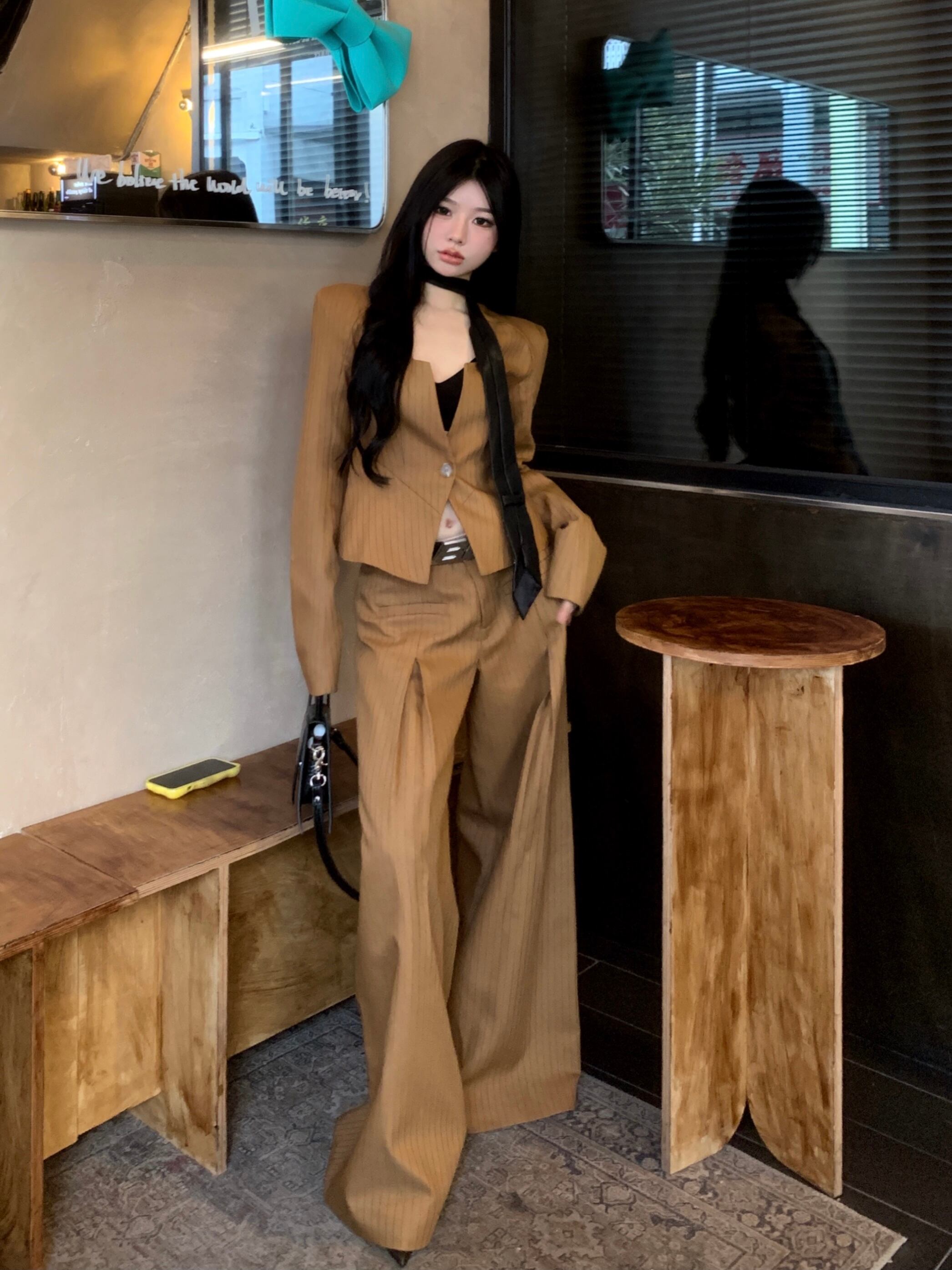 香港スタイルレトロスーツ秋ストライプ肩パッドコートローウエストワイドレッグパンツツーピースセット服 オータム 秋物 ワイドパンツ