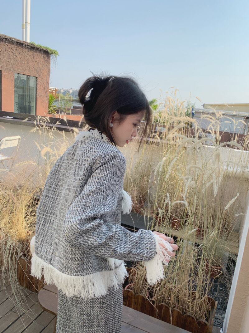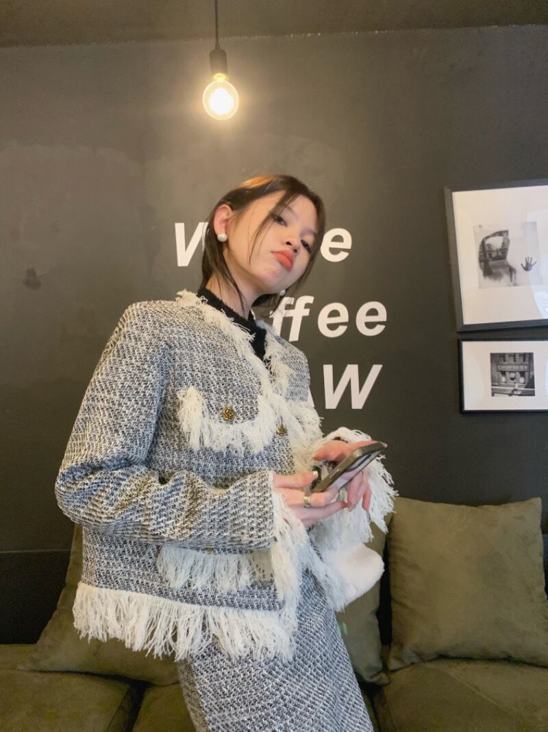 フランスオフィスレディ織スーツ秋テルコート V ネックルーズトップウエストロングスカート 2 点セット服 オータム 秋物 Vネック 会社 学校 通勤や通学にも