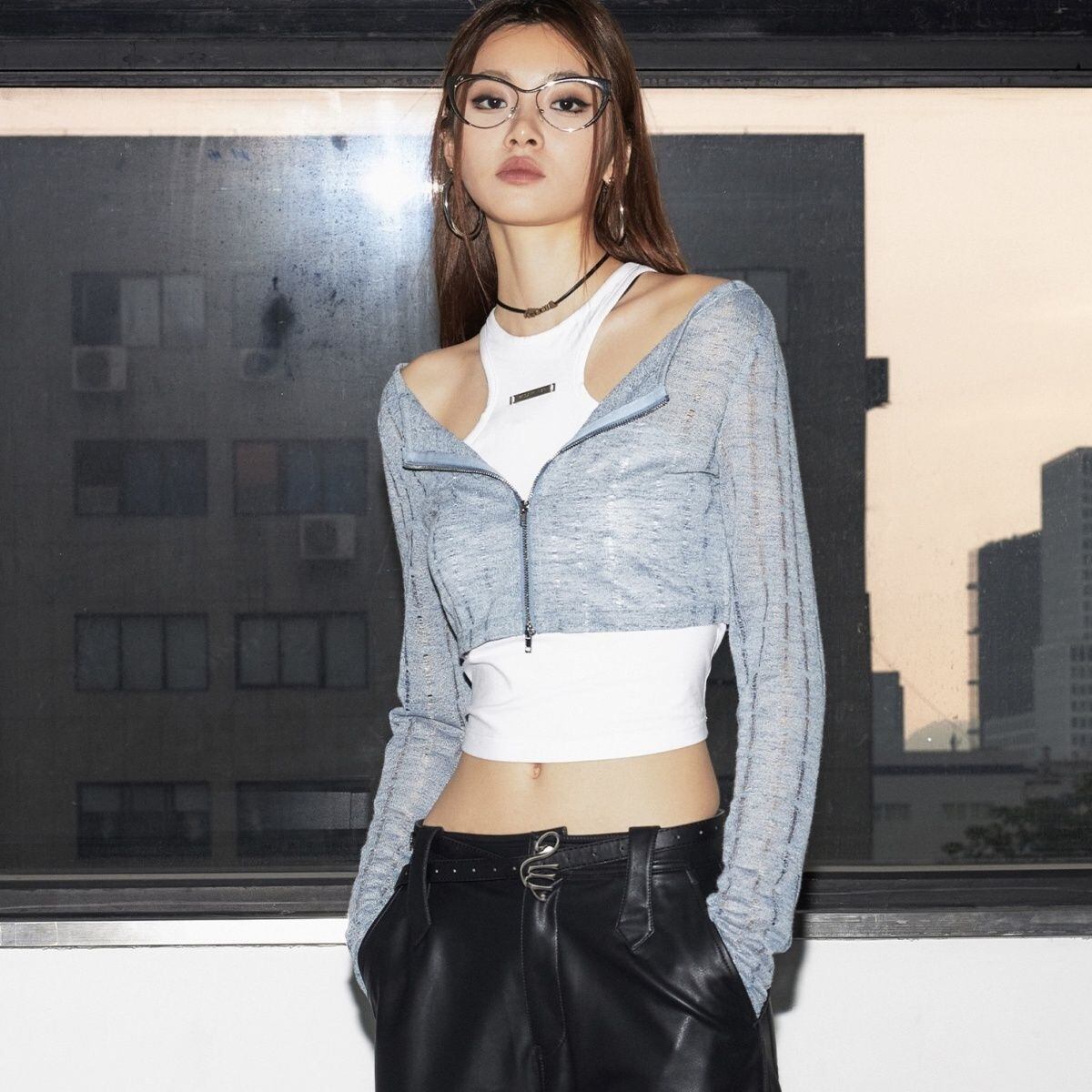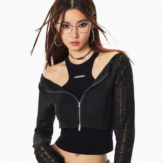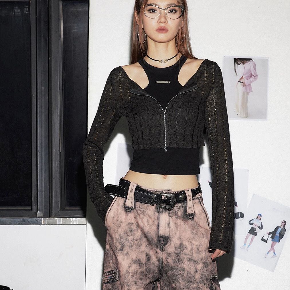 ホットガールアメリカンホワイトタンクトップ長袖Tシャツ秋フェイクツーピースオフショルダーショートカーディガン ロング オータム 秋物