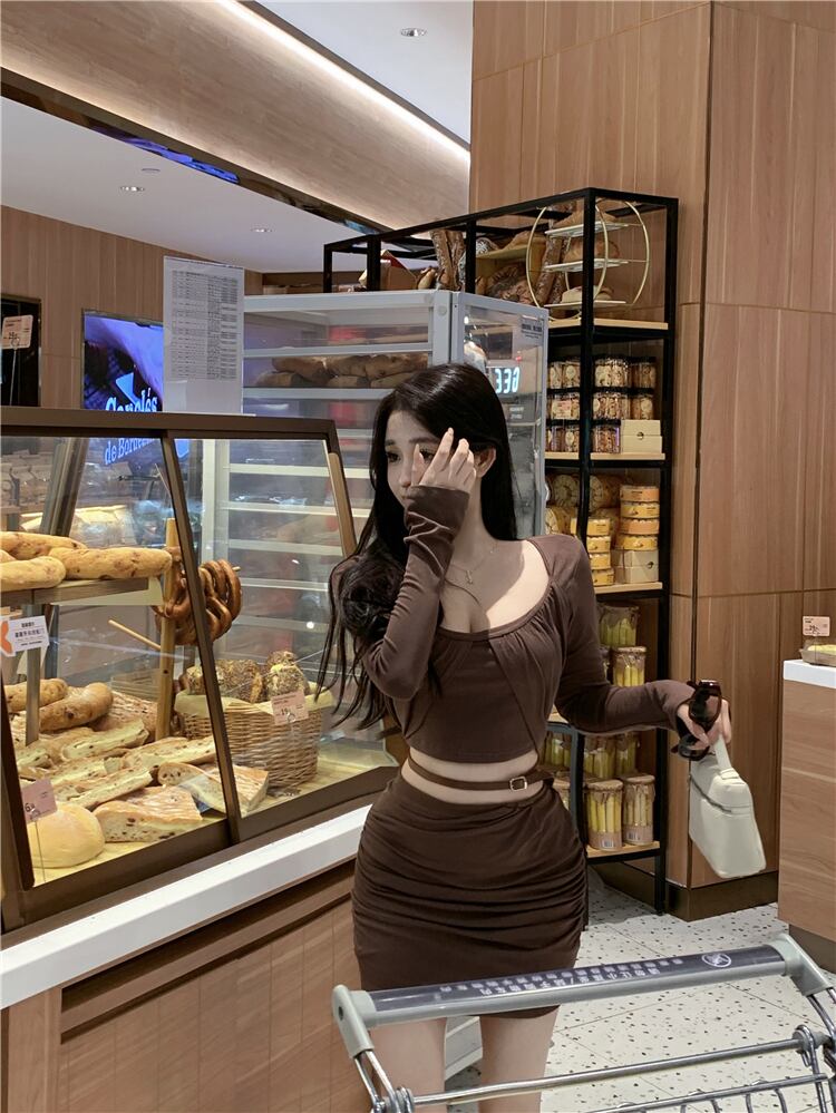 ホットガールズセクシースーツ秋スリムフィット長袖 Tシャツトップウエストミニスカートツーピースセット服 ロング オータム 秋物