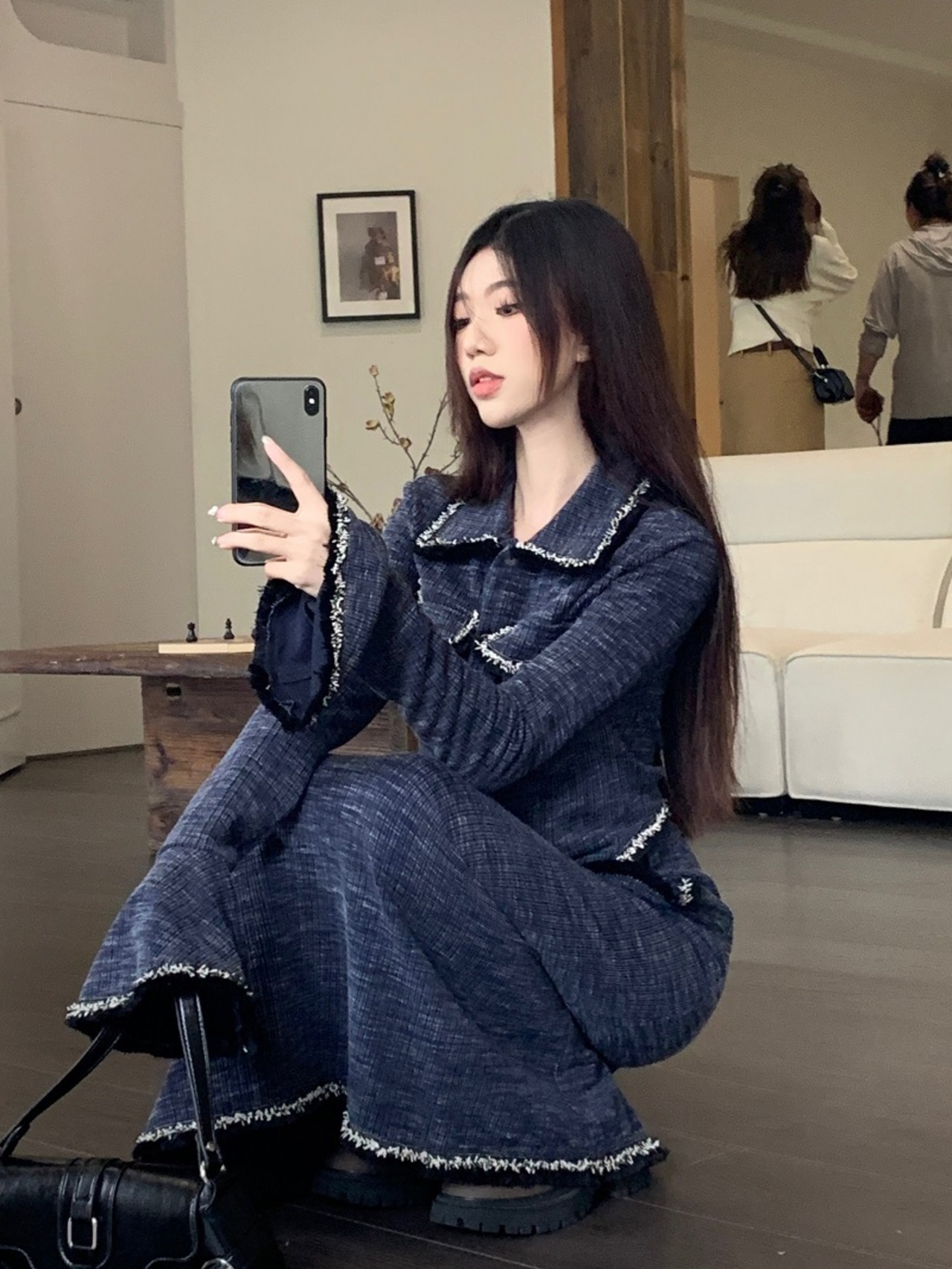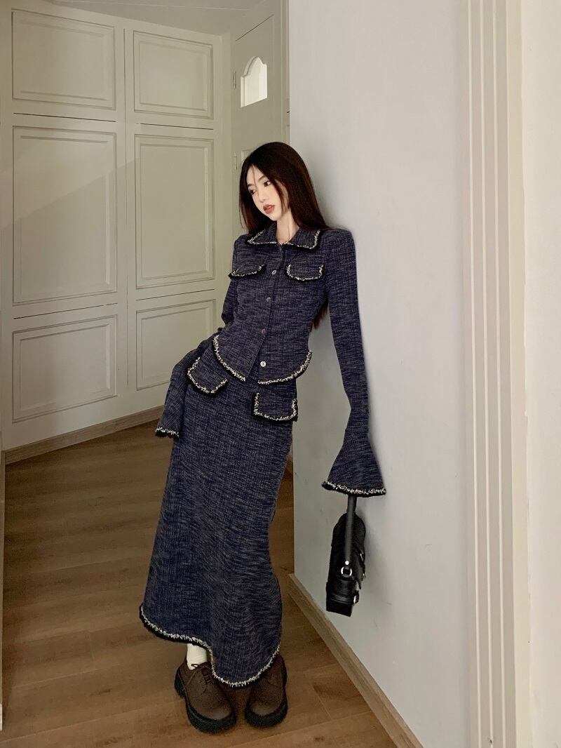 French Sweet Girl スーツ レディース 秋 フレアスリーブ ニット カーディガン ウエスト Aライン ロングスカート 2点セット 服 大人ガーリー スウィート キュート カジュアル オータム 秋物