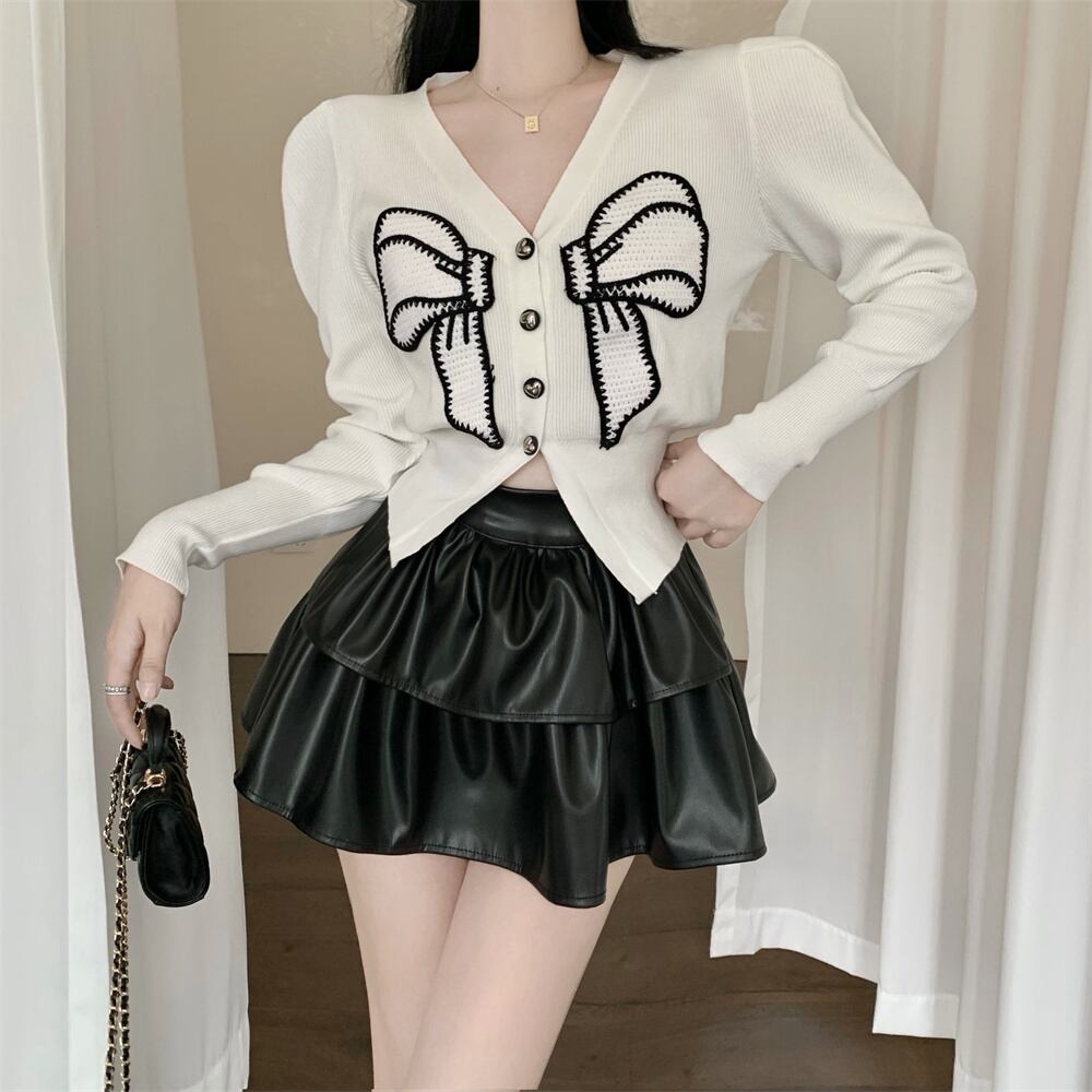 フレンチスイートホットガールスーツ秋弓 V ネックニット黒ウエストケーキスカート 2 点セット服 ブラック リボン 大人ガーリー スウィート キュート カジュアル オータム 秋物 Vネック