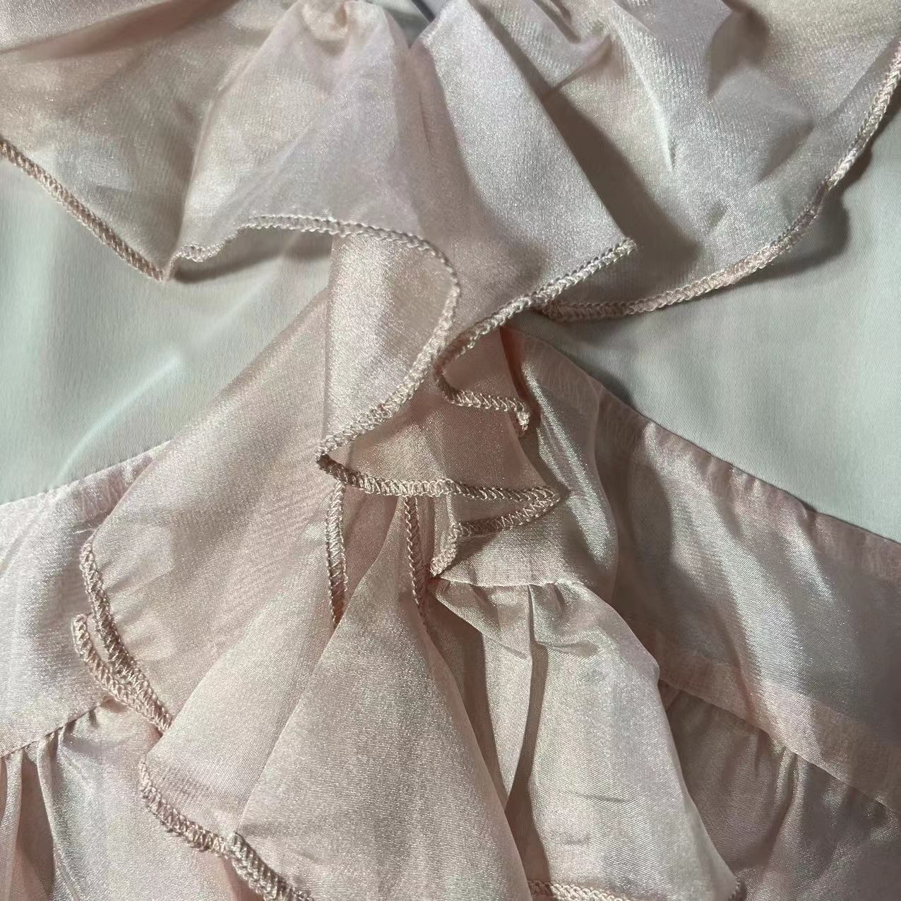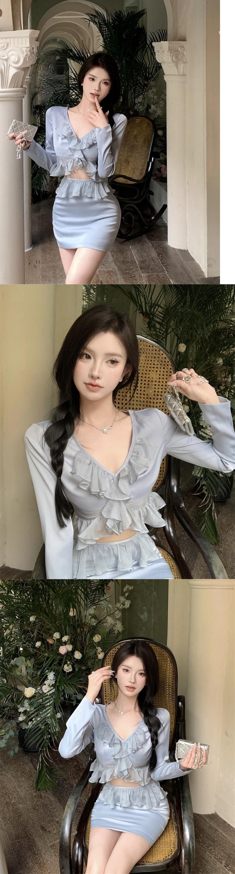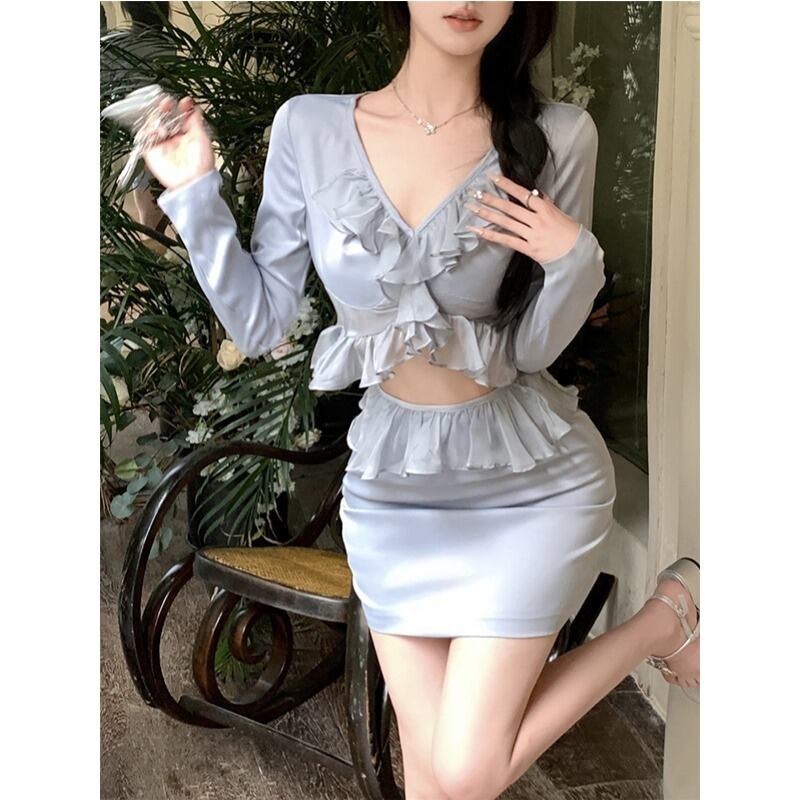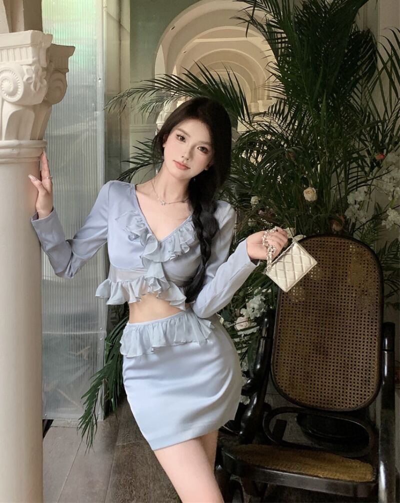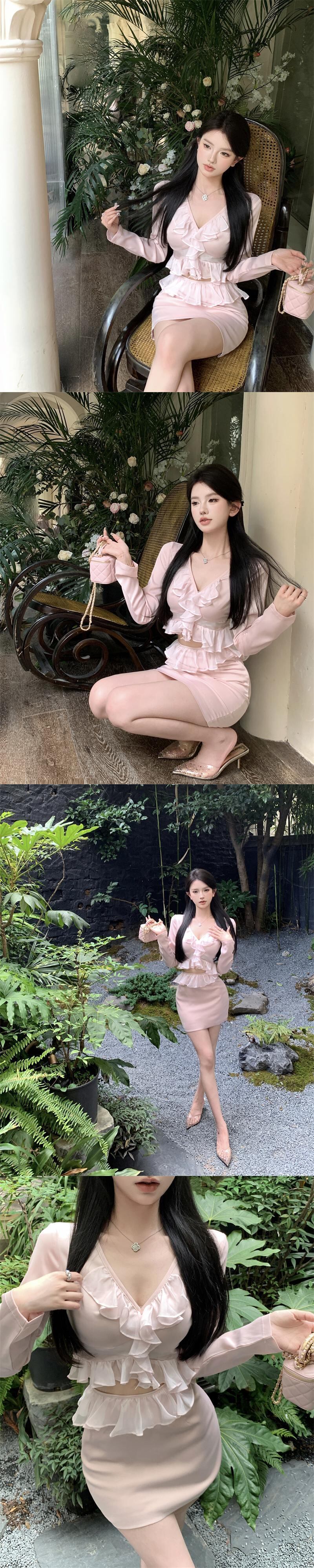 甘いホットガールスーツ秋ピンク V ネックフリル長袖トップウエストスカート 2 点セット服 ロング 大人ガーリー スウィート キュート カジュアル オータム 秋物 Vネック