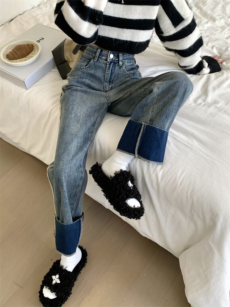 甘いホットガールパッチワークカフスジーンズ秋/秋ウエストルーズワイドレッグパンツ服 大人ガーリー スウィート キュート カジュアル オータム 秋物 ワイドパンツ