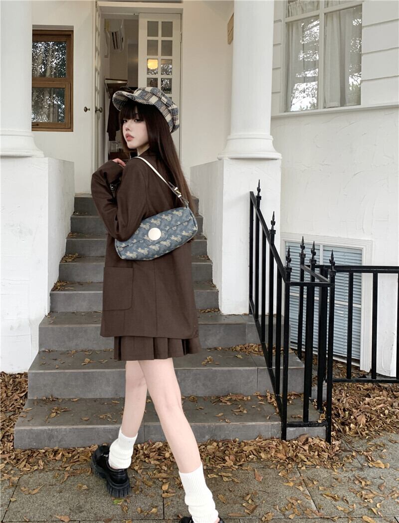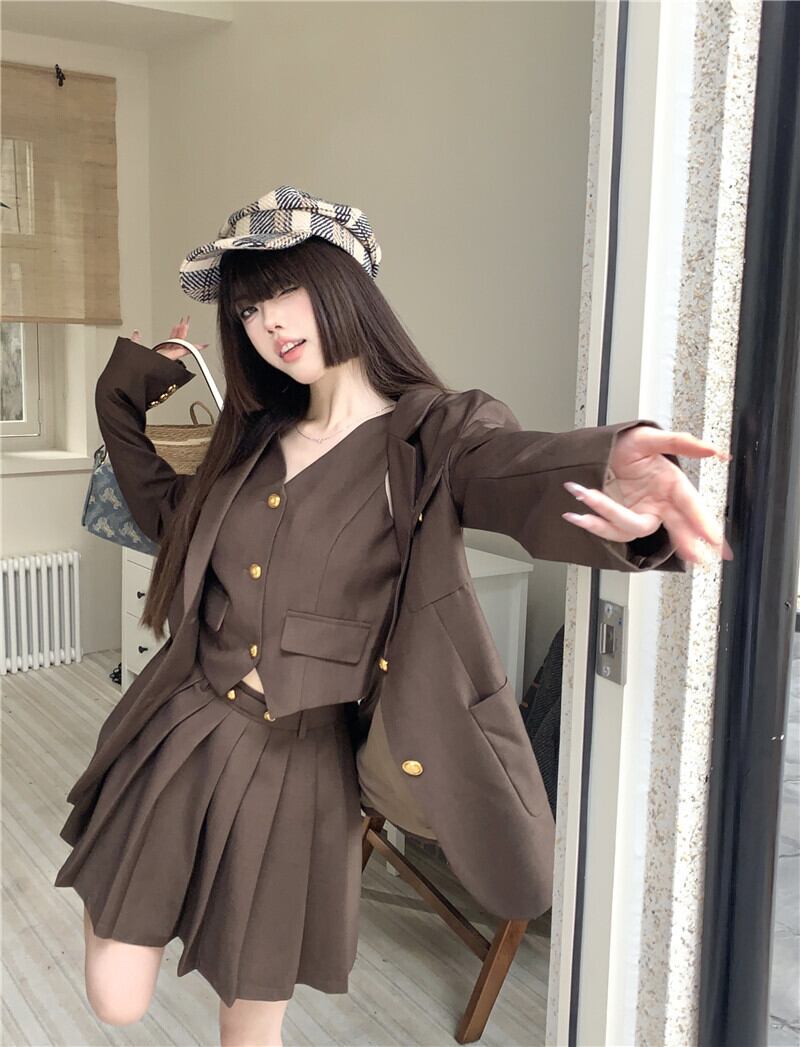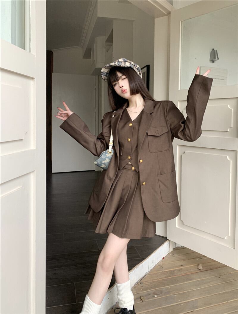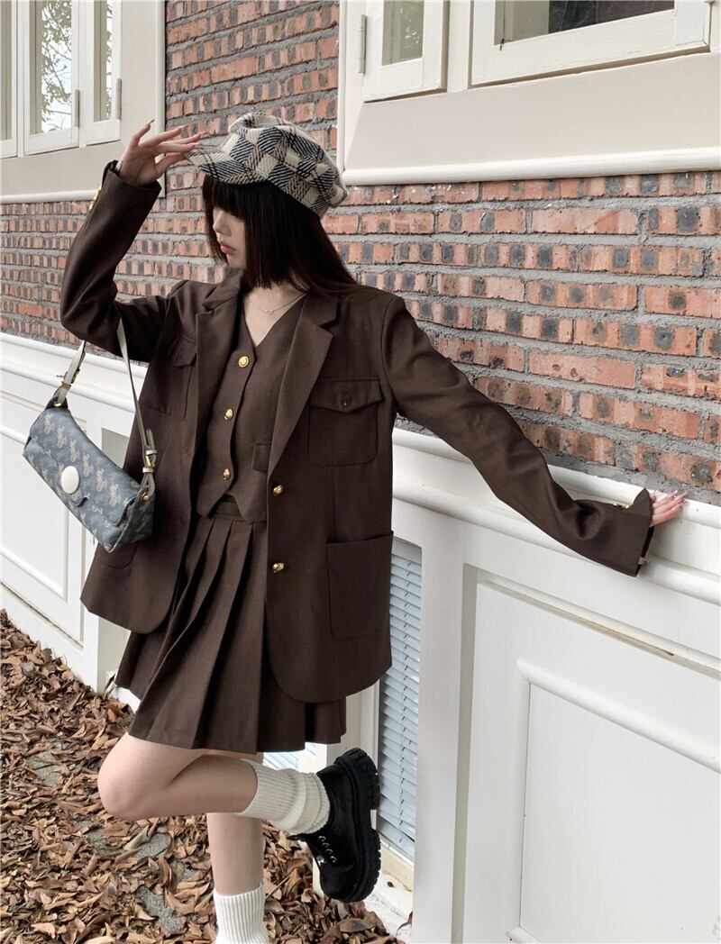 ホットガールプレッピースタイルスーツ秋 V ネックベスト長袖コート A ラインミニスカート 3 点セット服 ロング オータム 秋物 Vネック Aライン