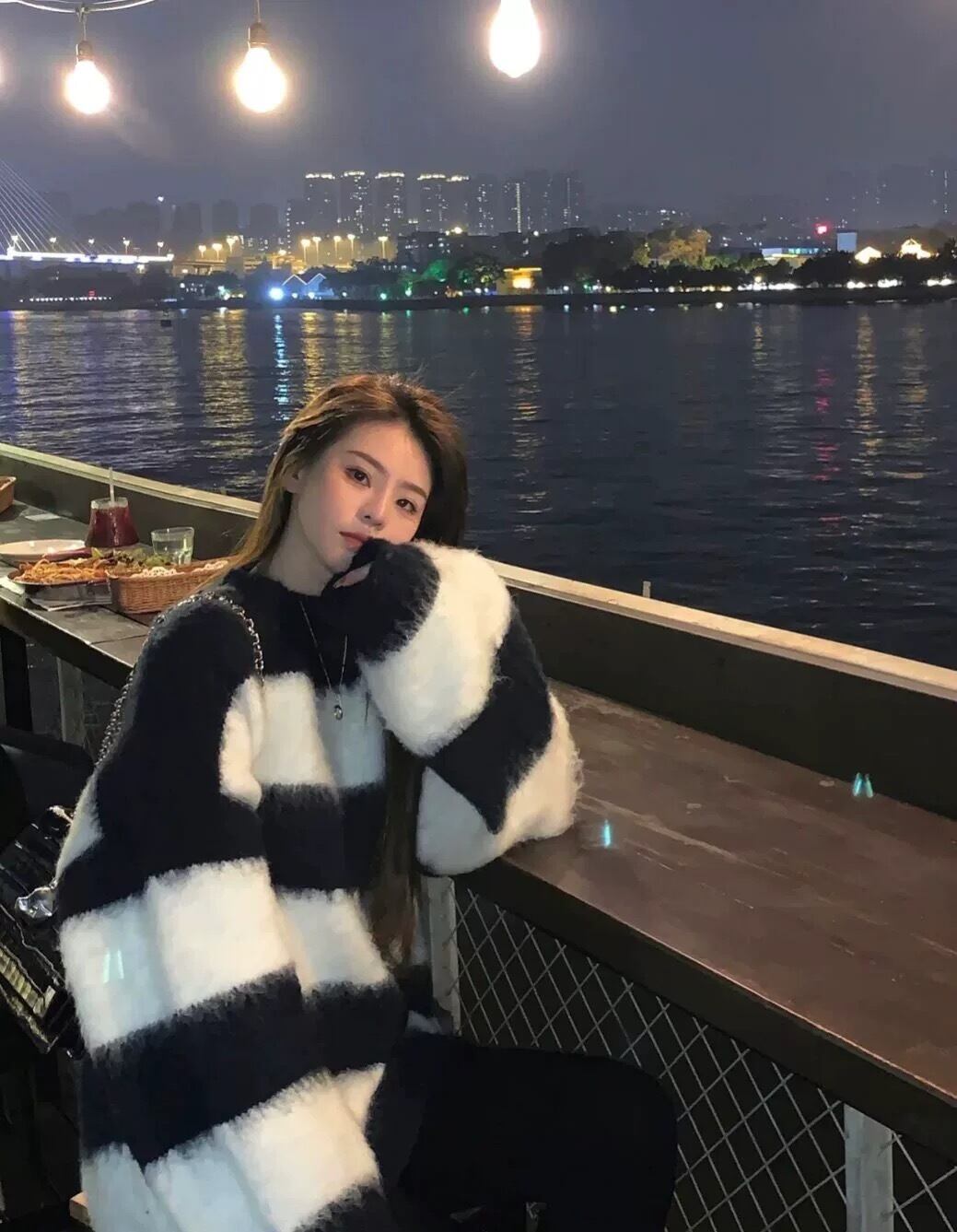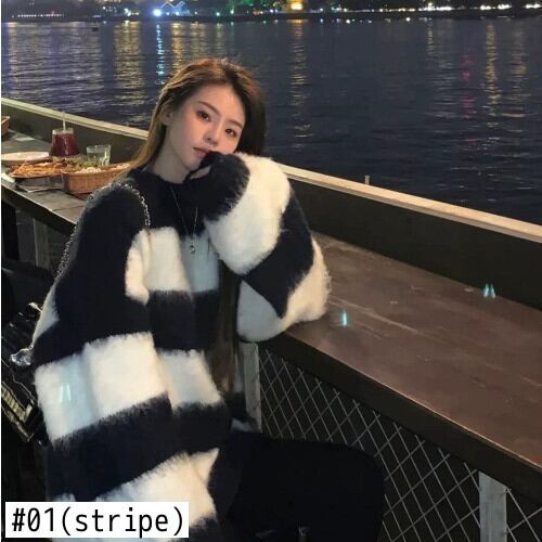スタイルルーズフィットニットウェア秋と冬ストライプラウンドネックカラーマッチングセーター オータム 秋物 ウィンター 冬物 Oネック