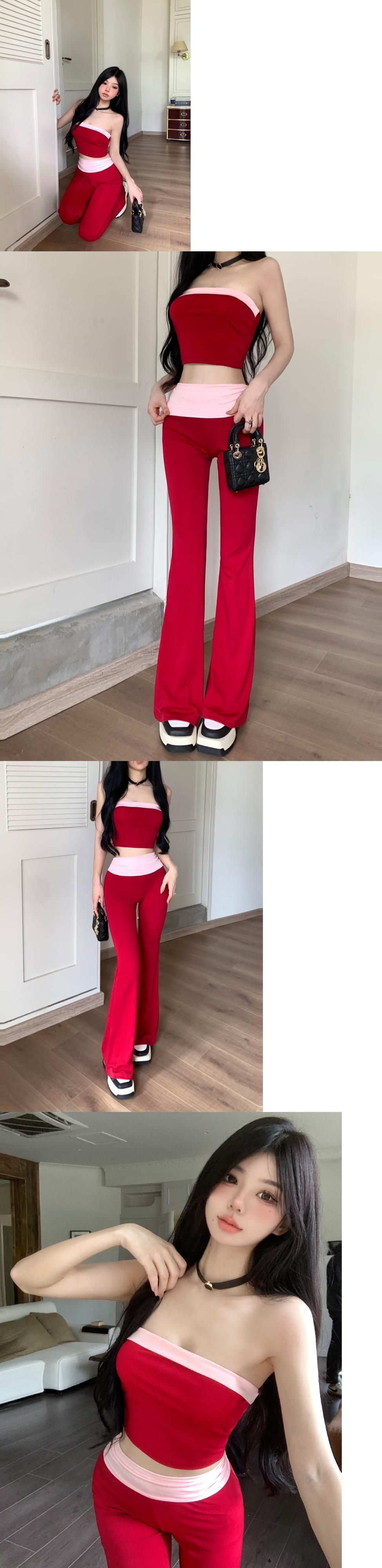 甘いホットガールズスーツ秋コントラストストラップレスベストトップスリムフィットフレアワイドレッグパンツ 2 点セット Fsahion 服 大人ガーリー スウィート キュート カジュアル オータム 秋物 ワイドパンツ