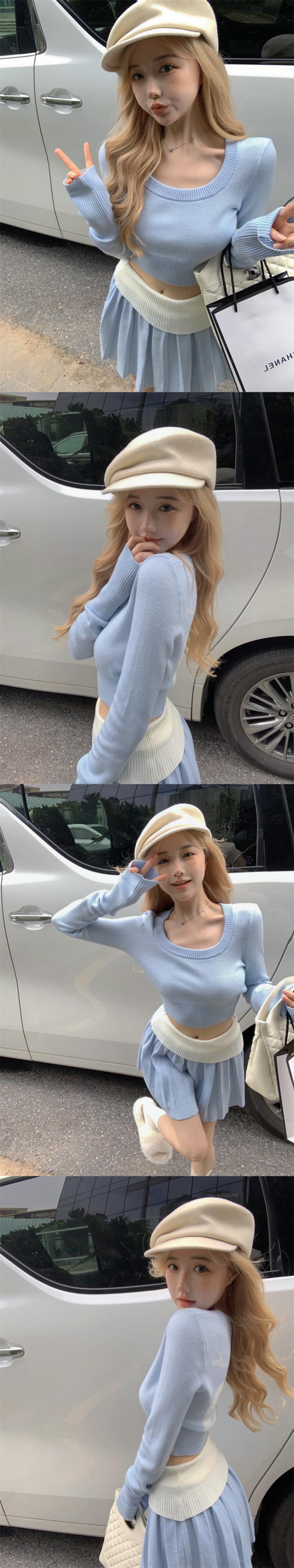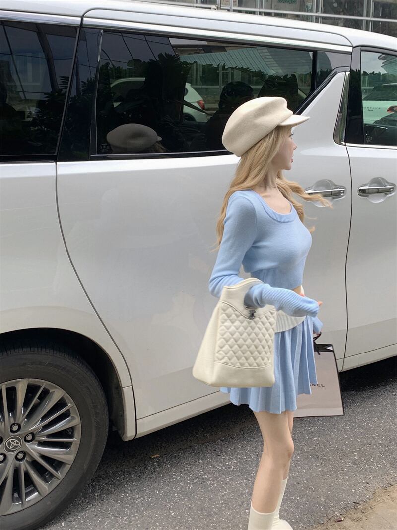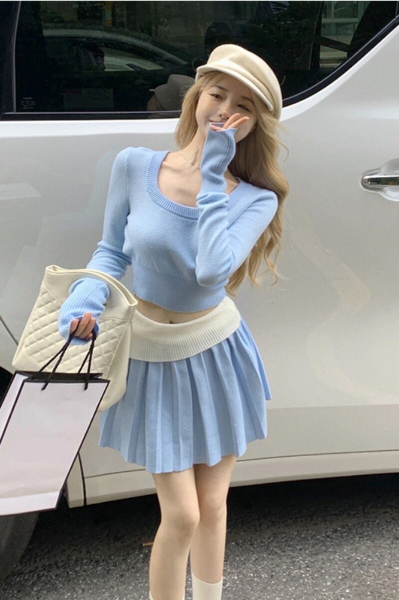 スーツ秋スリムフィット長袖ニットシャツ弾性ウエストプリーツスカート 2 点セット服 ロング エラスティック 伸縮 オータム 秋物