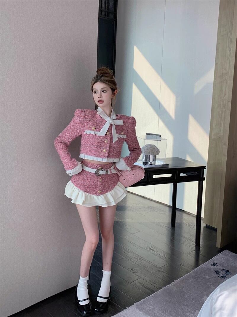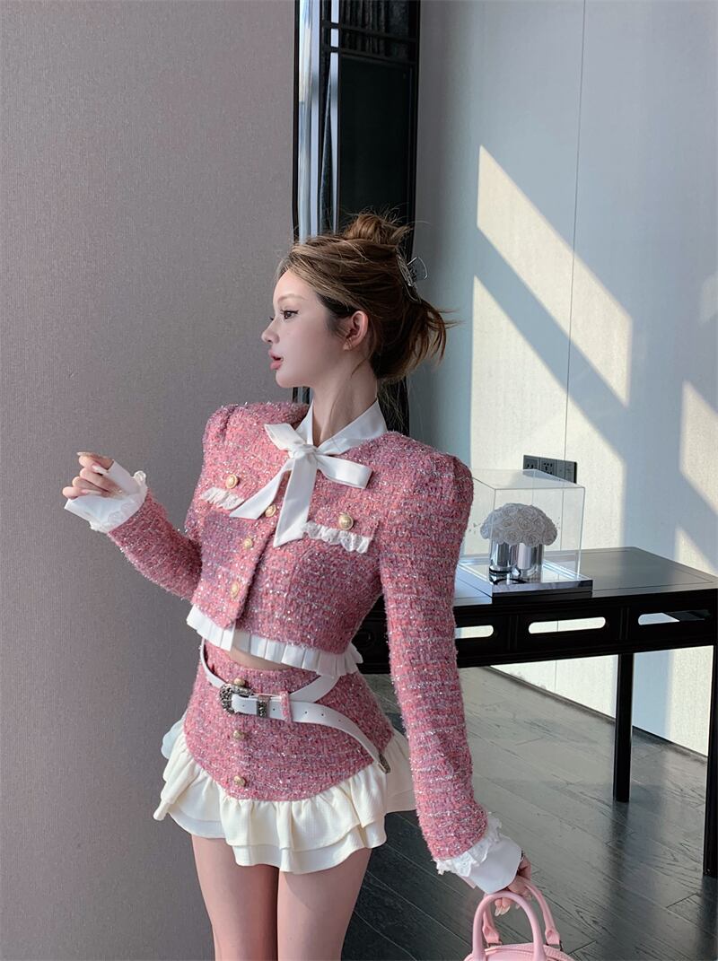 甘いホットガールスーツ秋弓長袖ショートジャケットトップ A ラインミニスカート 2 点セット服 ロング リボン 大人ガーリー スウィート キュート カジュアル オータム 秋物 Aライン