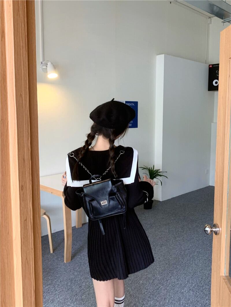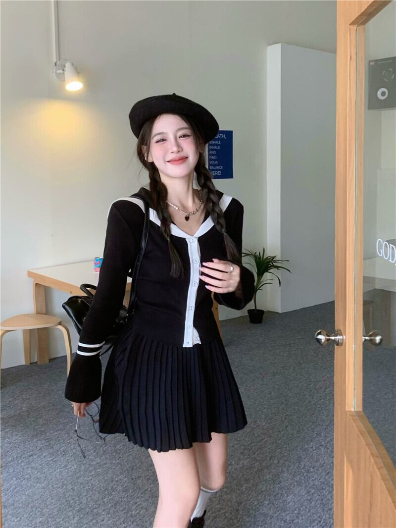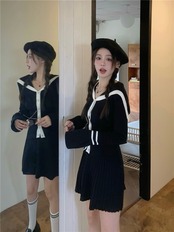 Sweet Girl ニットスーツ レディース 秋 セーラー襟 コントラスト 長袖 トップス Aライン スカート ツーピースセット服 ロング 大人ガーリー スウィート キュート カジュアル オータム 秋物