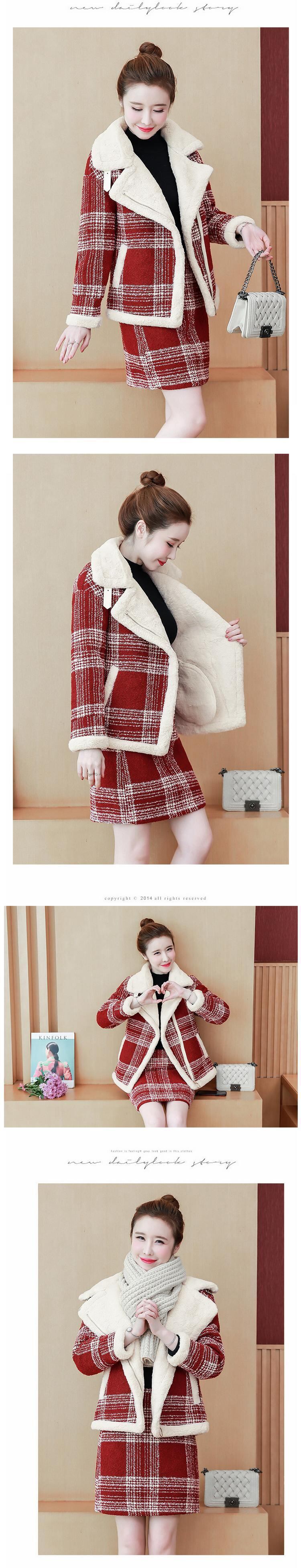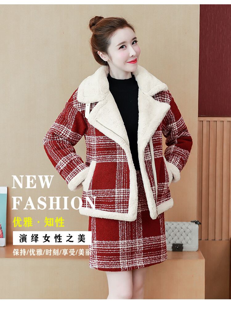 スイートガールスーツ秋/冬ラムフリースチェック柄コートウエストショートスカート肥厚暖かいツーピースセット服 大人ガーリー スウィート キュート カジュアル オータム 秋物 ウィンター 冬物