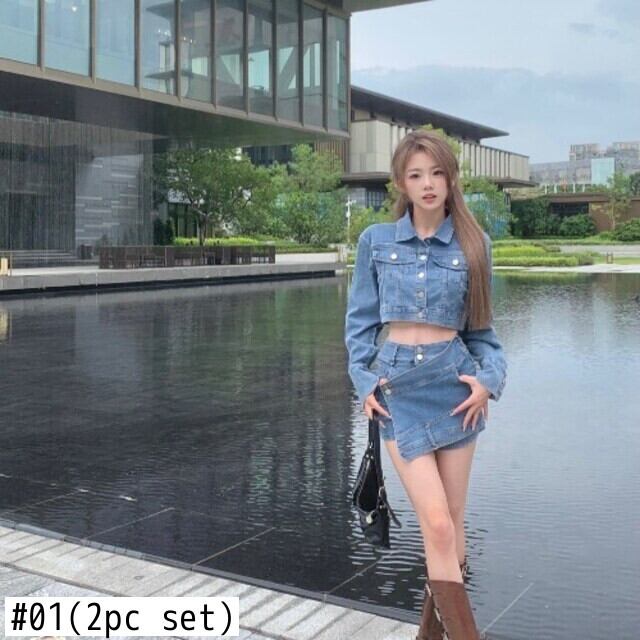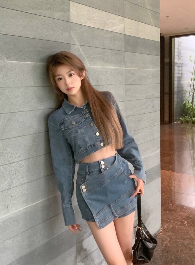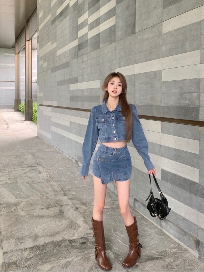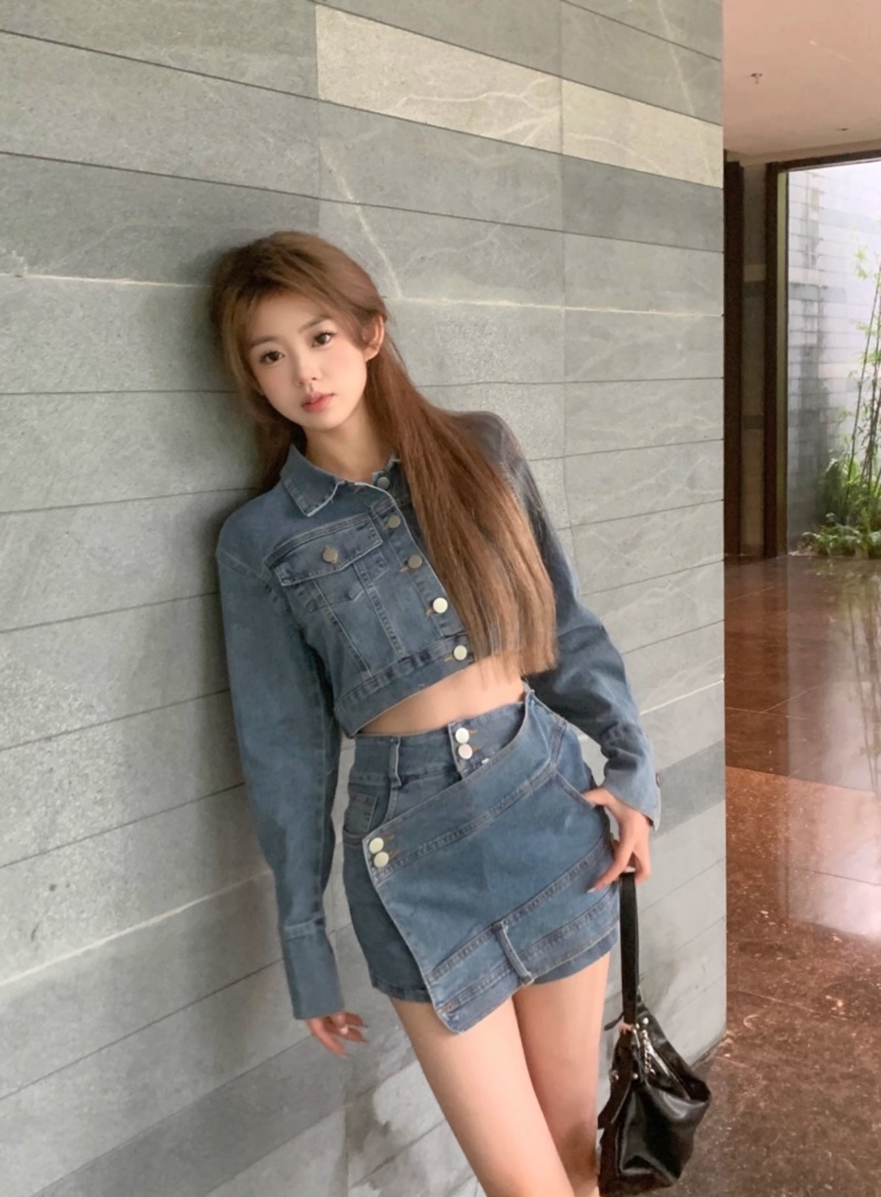 甘くてクールホットガールデニムスーツ秋長袖コート非対称ミニスカート 2 点セット服 ロング 大人ガーリー スウィート キュート カジュアル オータム 秋物