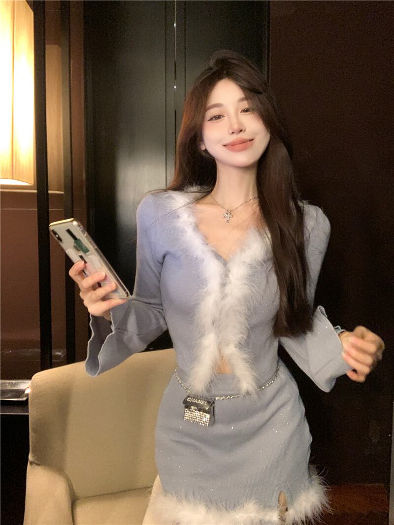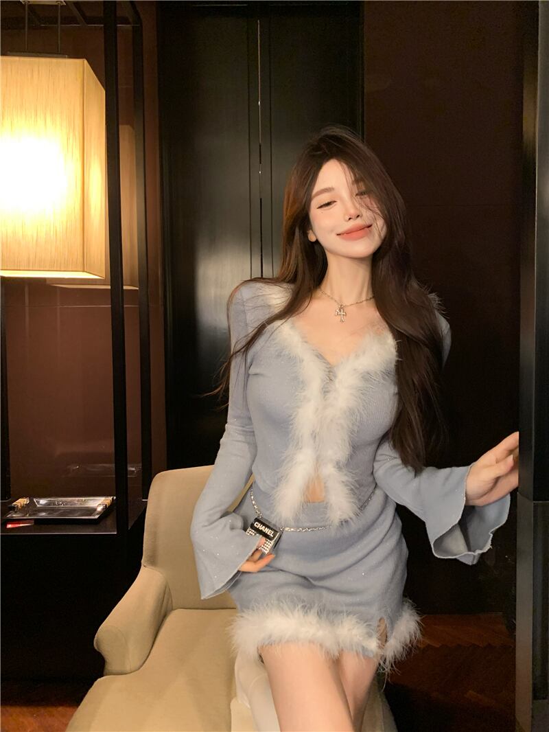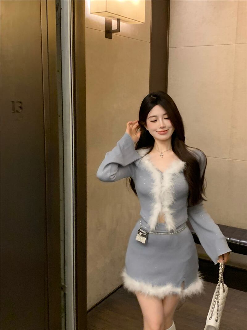 ホットガールスーツ秋 V ネックスリムフィットぬいぐるみニットカーディガンウエストミニスカート 2 点セット服 オータム 秋物 Vネック