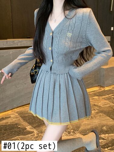 アカデミー スタイル ニット スーツ レディース 秋 長袖 スリム フィット V ネック カーディガン トップ プリーツ ショート スカート 2 点セット ロング オータム 秋物 Vネック