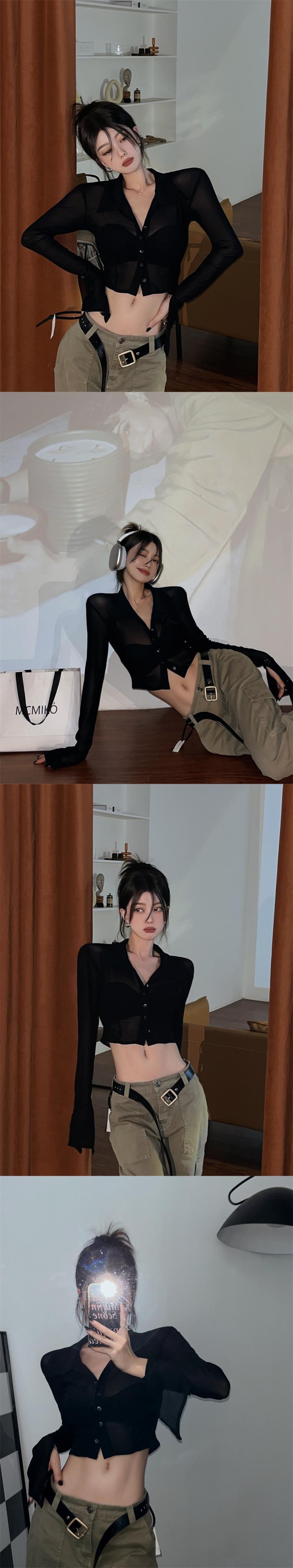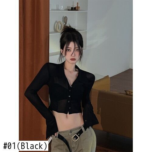 アメリカンメッシュ長袖ボトムトップホットガールスリムフィット透明セクシーショートシャツ服 ロング