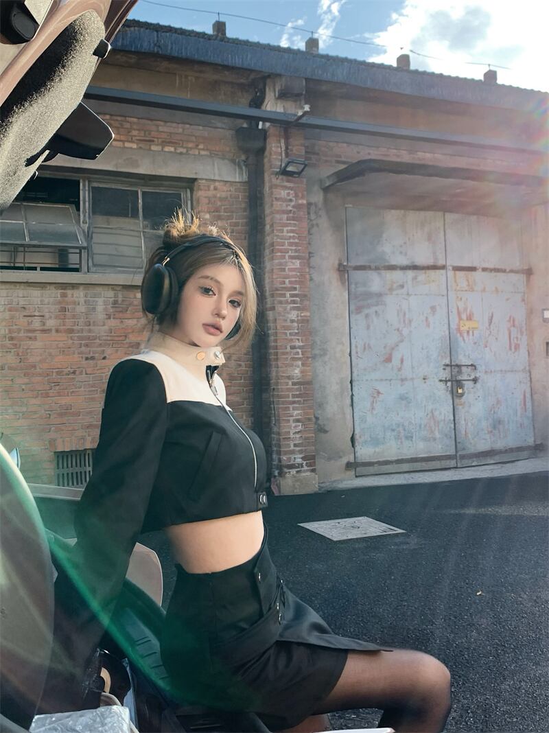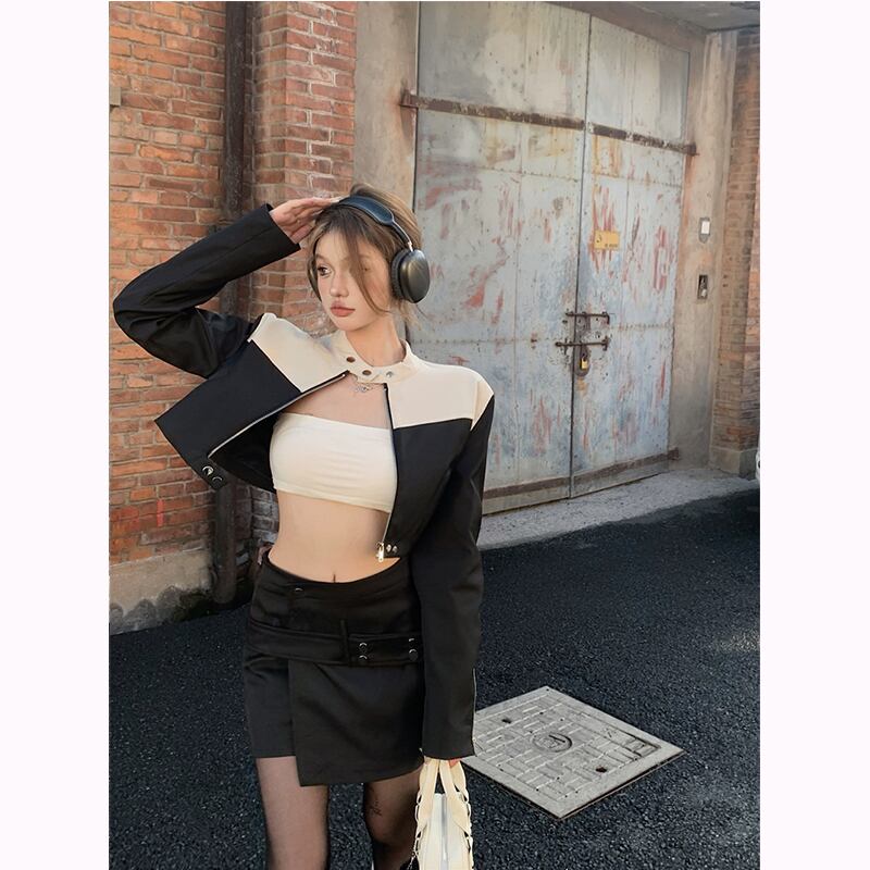 ホットガールスーツ立ち襟長袖ショートコートオートバイジャケットウエストラップヒップショートスカート 2 点セット ロング