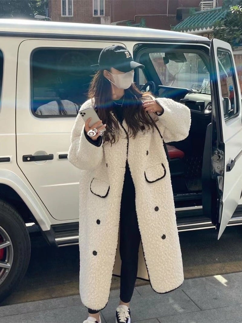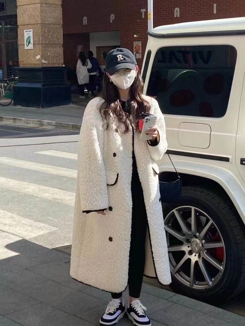 甘いホットガールラムウールコート秋/冬ダブルブレストミッドレングス V ネック厚さジャケット服 大人ガーリー スウィート キュート カジュアル オータム 秋物 ウィンター 冬物 Vネック