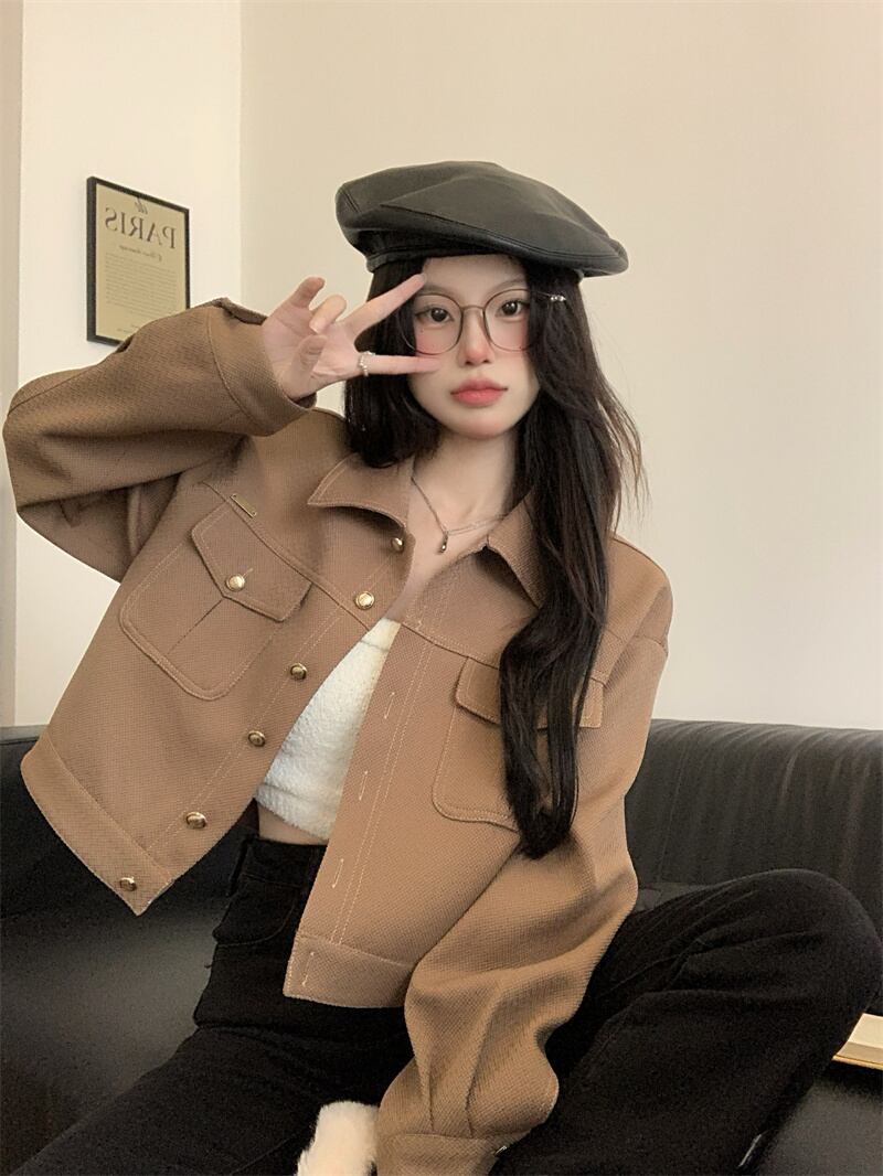 甘いホットガールレトロ香港スタイルショートジャケット秋ターンダウン襟長袖スリムフィットコート服 ロング 大人ガーリー スウィート キュート カジュアル オータム 秋物