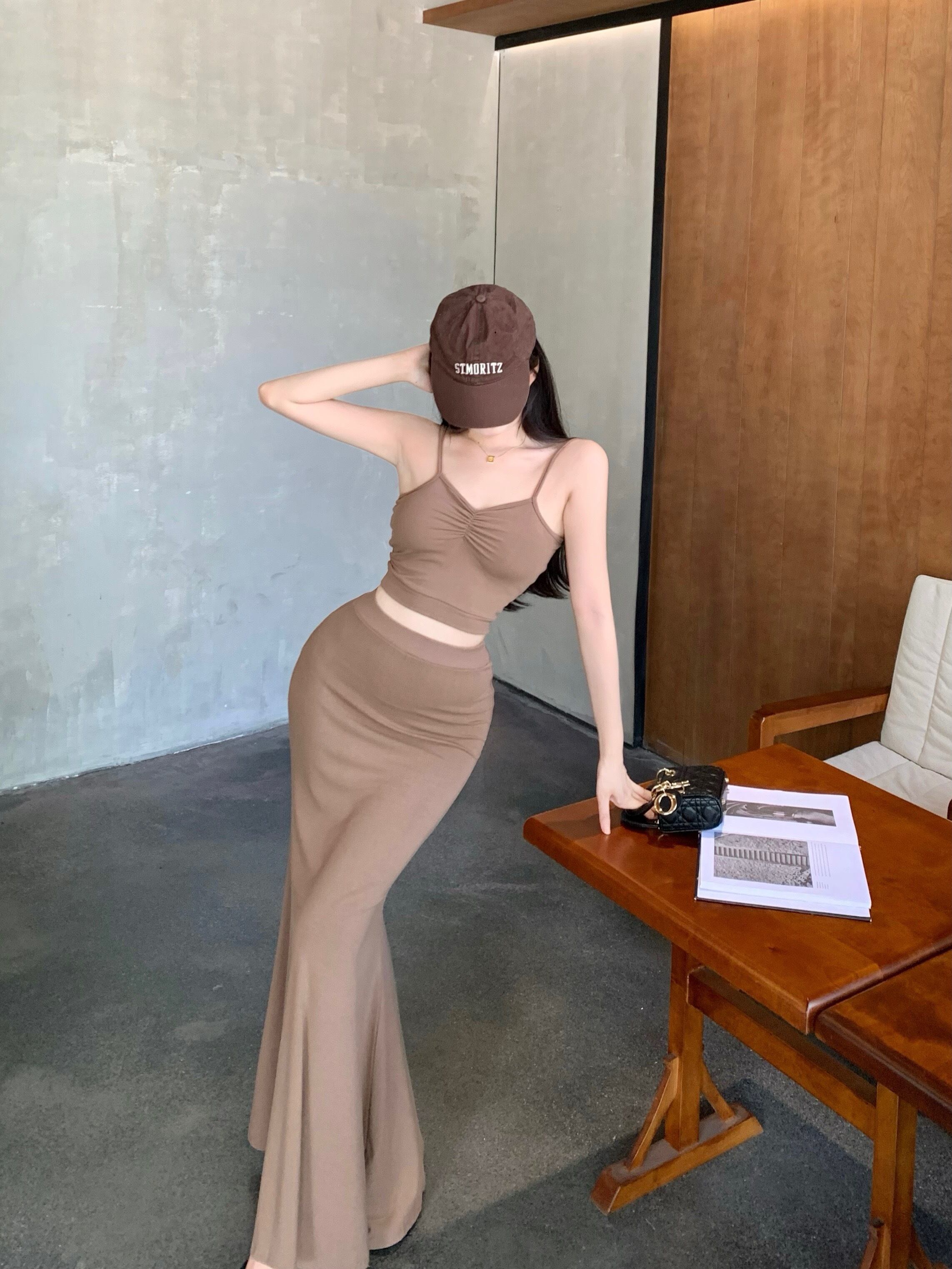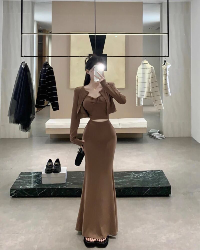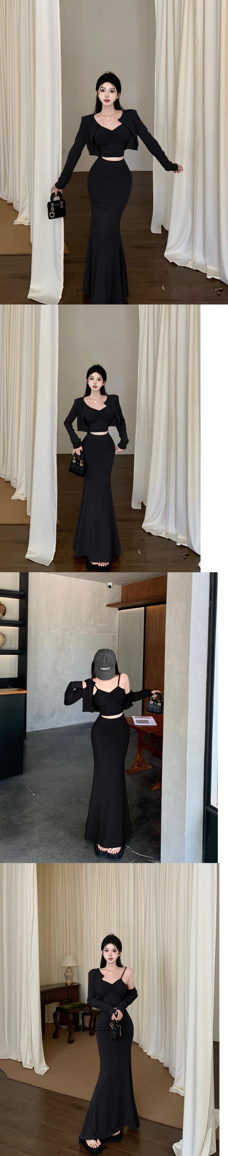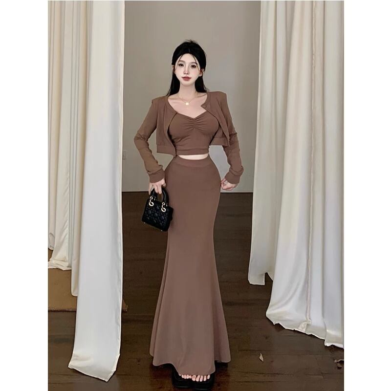 スーツ レディース 秋 ピュア セクシー 長袖 カーディガン キャミソール ウエスト マーメイドスカート 3点セット ロング オータム 秋物