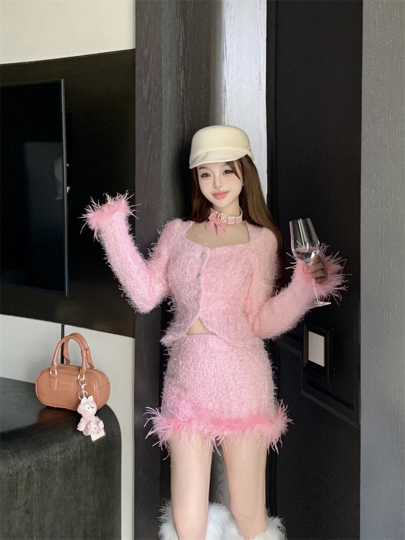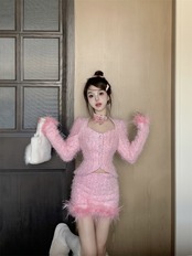 ホットガールスプライススーツ秋ピンクスクエアカラー長袖ショートコートラップヒップスカートミニスカートツーピースセット ロング オータム 秋物 スクウェア
