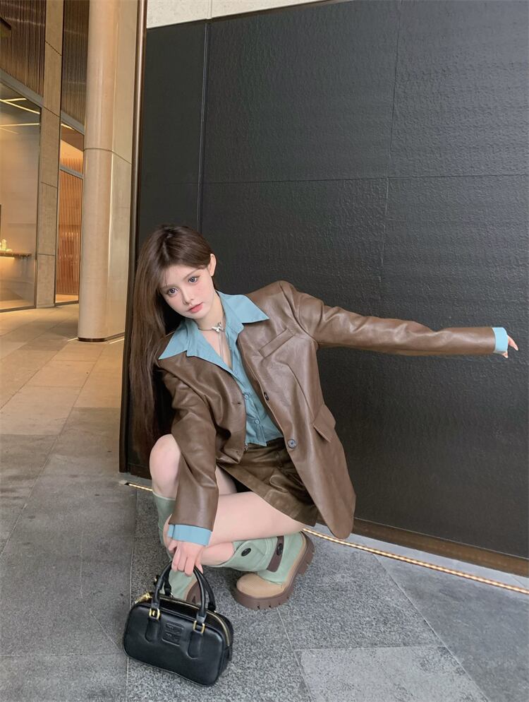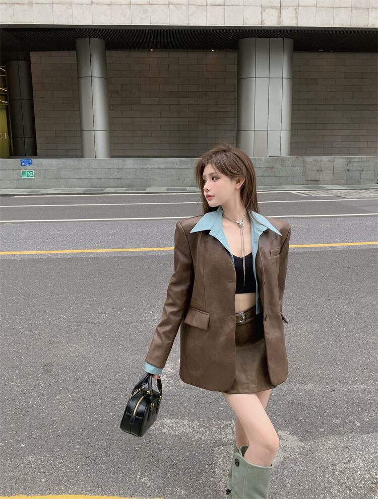 アメリカンクールホットガールスーツ秋スプライスシャツ長袖レザーコートウエストレザーミニスカート2点セット ロング オータム 秋物