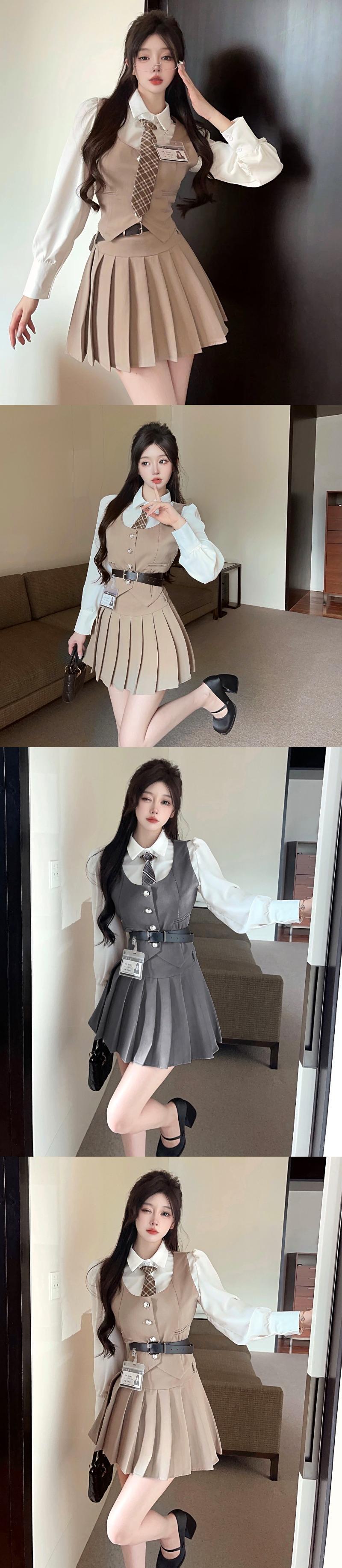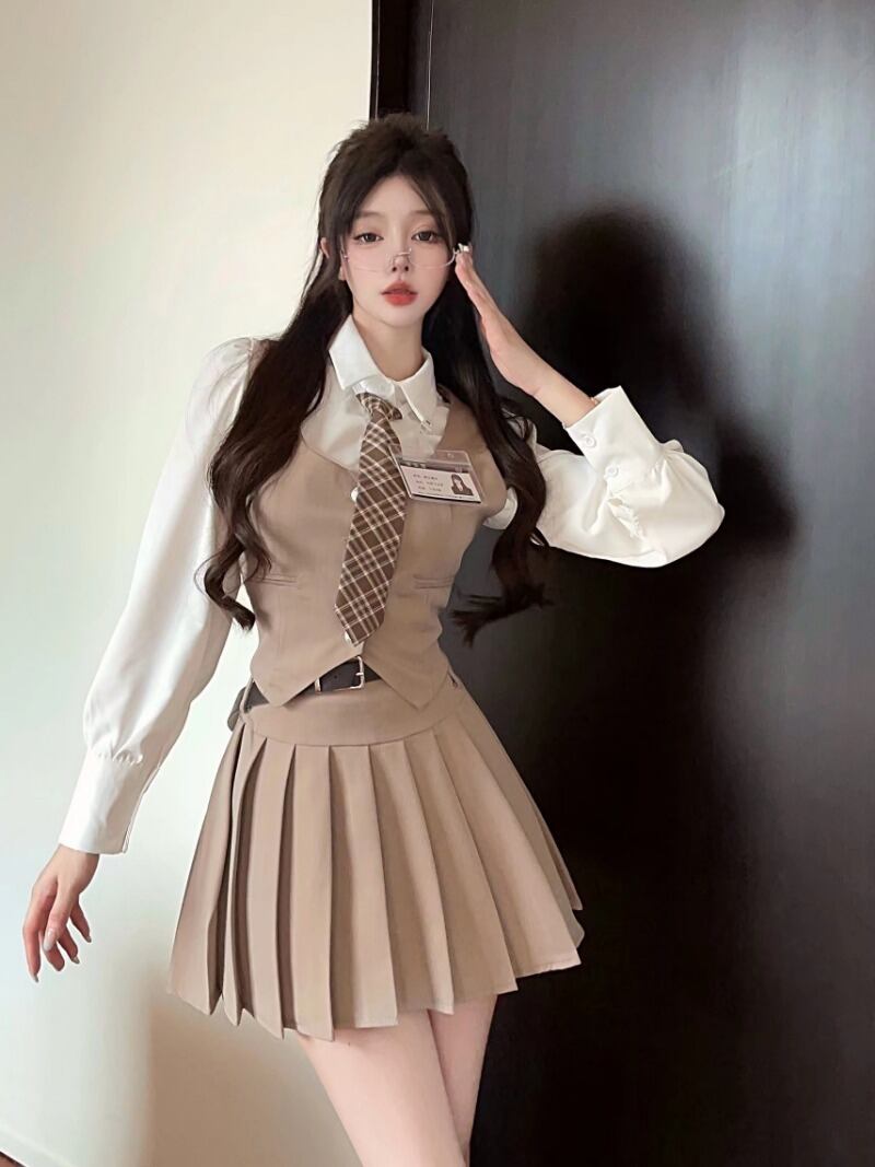 甘いホットガールプレッピー JK スーツ秋/冬ベストシャツウエストミニスカート 3 点セット服 大人ガーリー スウィート キュート カジュアル オータム 秋物 ウィンター 冬物