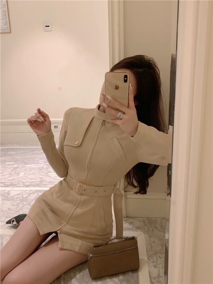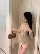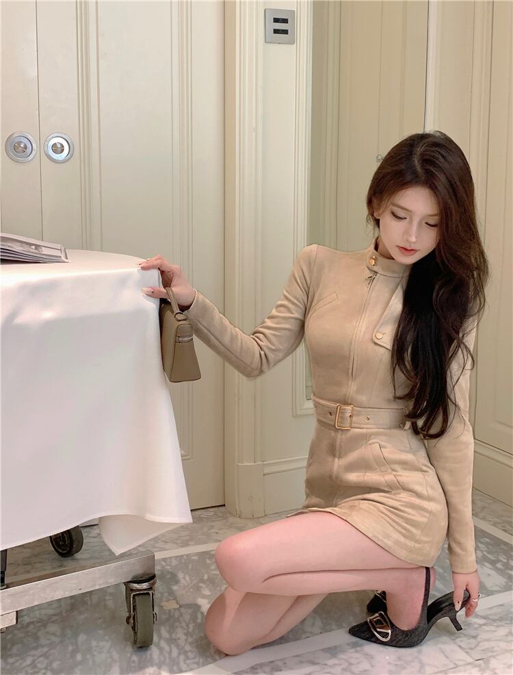 甘い女子立ち襟スリムフィットスエードベルトドレス秋長袖ジップアップコートトップ服 ロング スウェード 大人ガーリー スウィート キュート カジュアル オータム 秋物 ハーネス