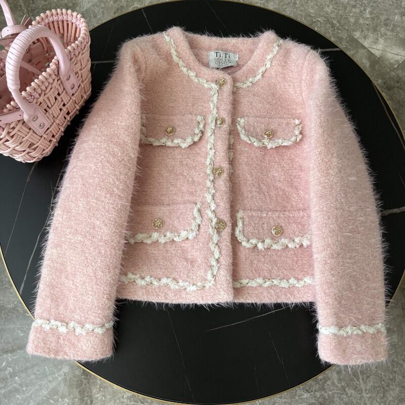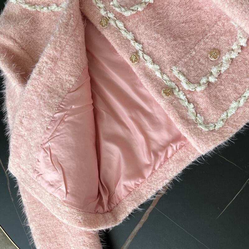 甘いホットガールピンクショートウールジャケット秋フレンチ O ネック長袖シングルブレストジャケット服 ロング 大人ガーリー スウィート キュート カジュアル オータム 秋物 Oネック