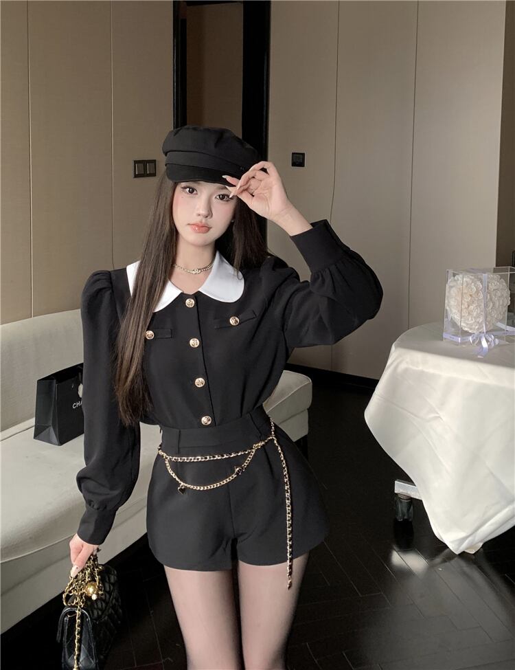 甘いホットガールコントラストカラースーツ秋パフスリーブ黒コートウエストショーツ 2 点セット服 ブラック 大人ガーリー スウィート キュート カジュアル オータム 秋物 ブルマー