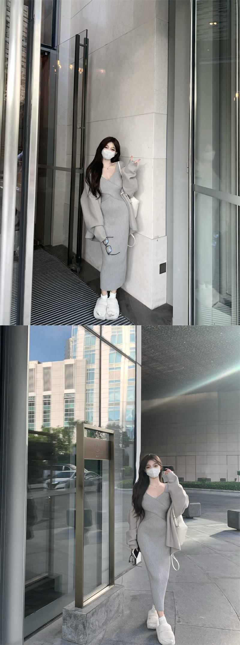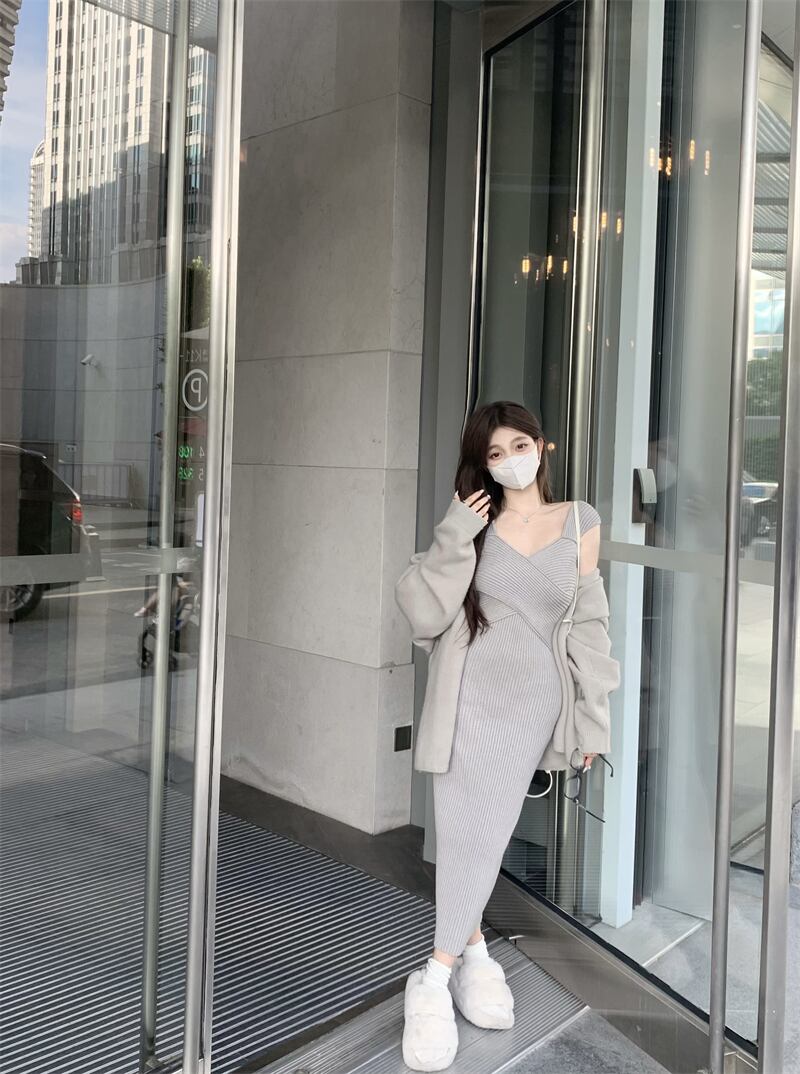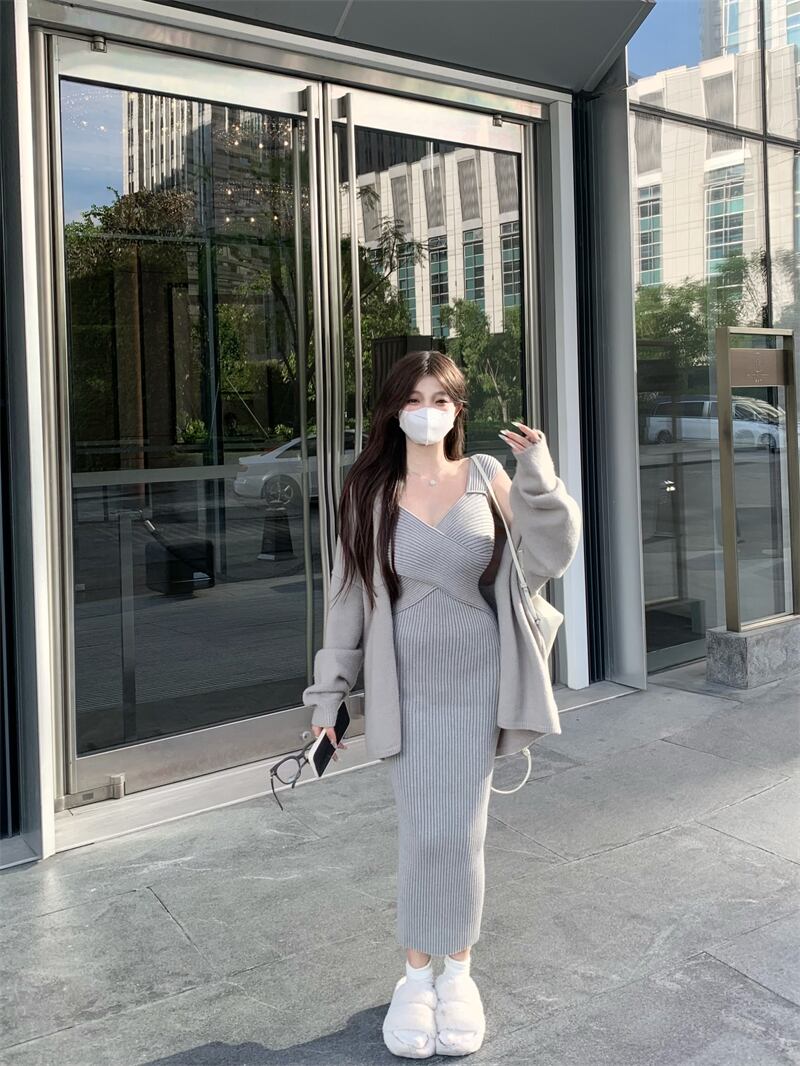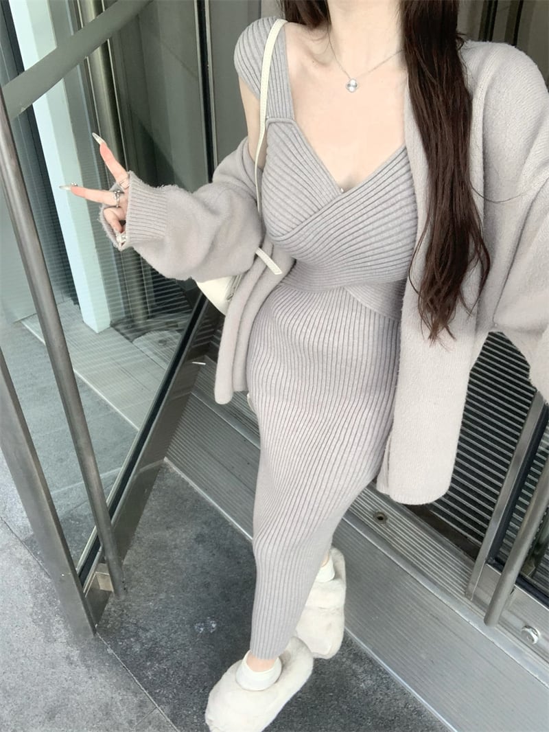 ホットガールセクシースーツ秋グレールーズセーターコートセクシー V ネッククロスニットドレスツーピースセット服 オータム 秋物 Vネック