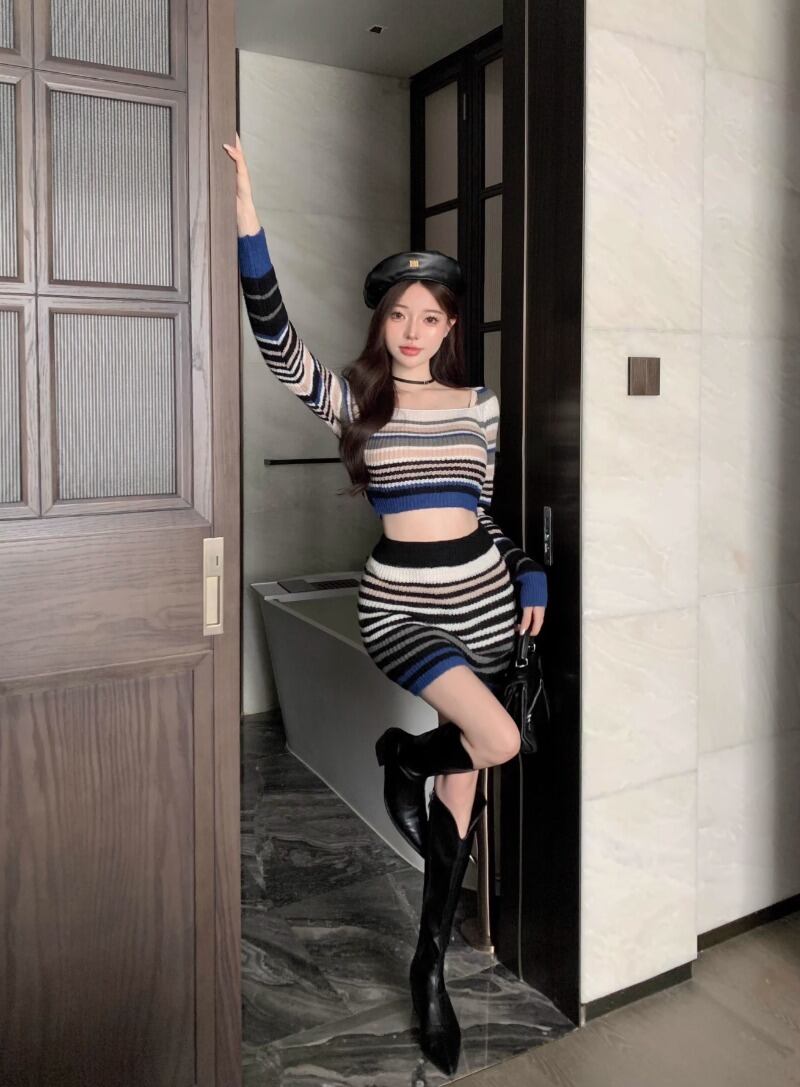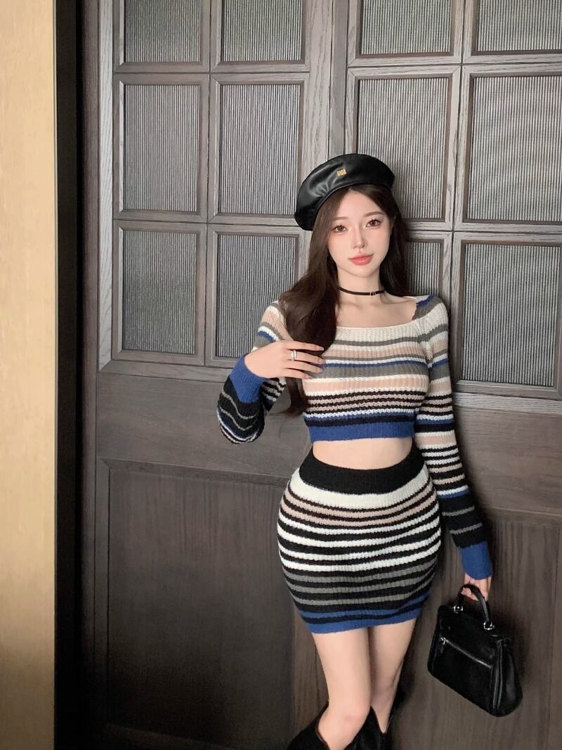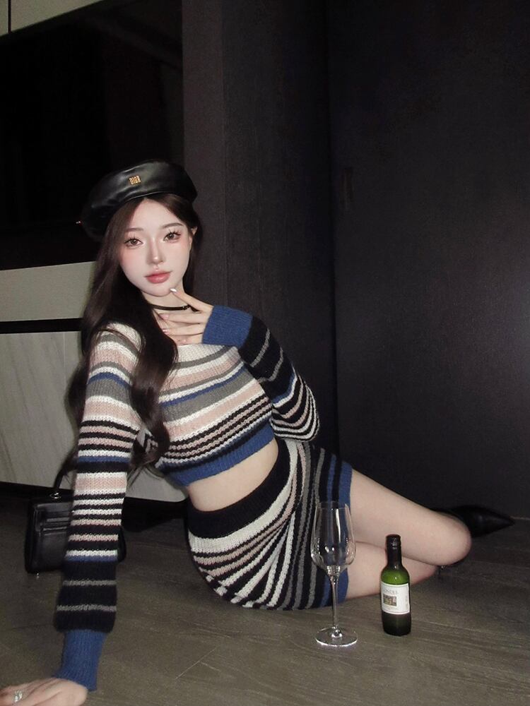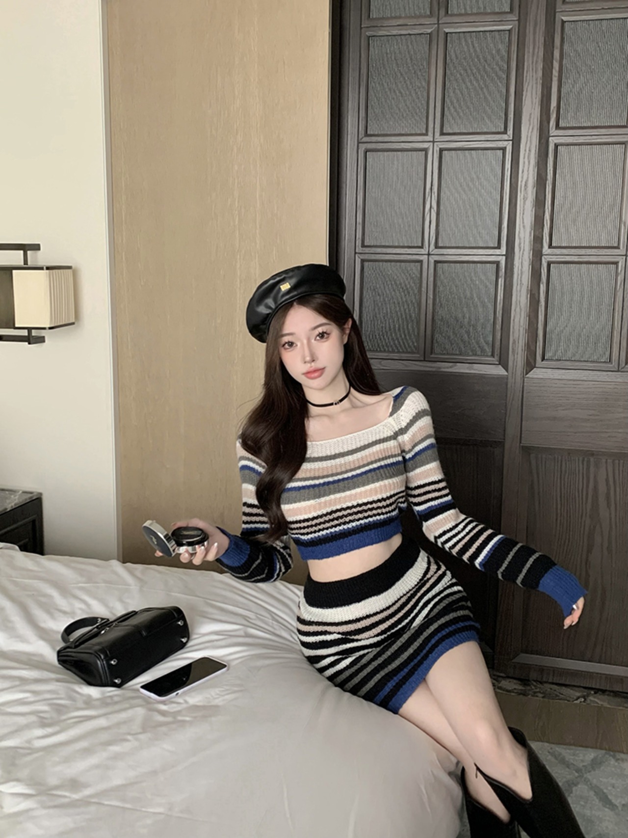 純粋セクシーホットガールズスーツ秋ストライプスクエアカラー長袖ニットシャツラップヒップミニスカートツーピースセット ロング オータム 秋物 スクウェア